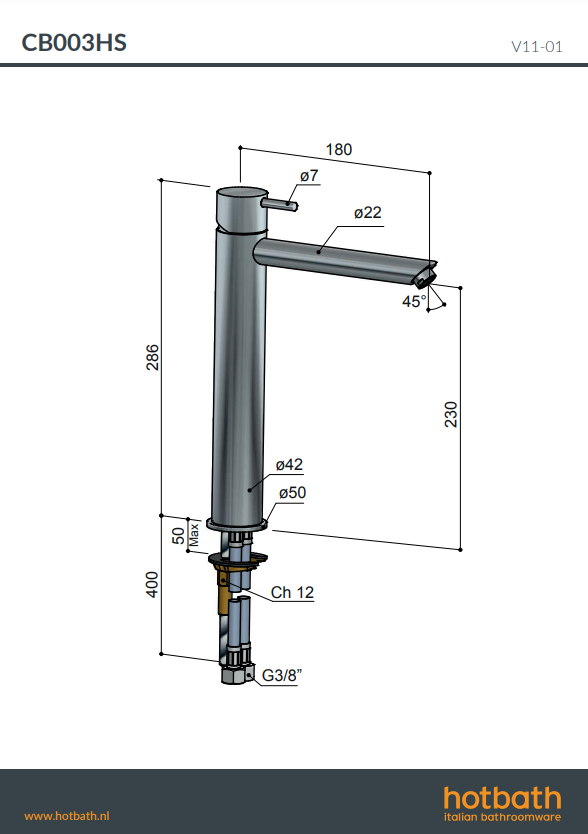 Cobber CB003HS wastafelmengkraan Hotbath H 286 mm x B (uitloop) 180 mm verkrijgbaar bij Stonecompany.nl.