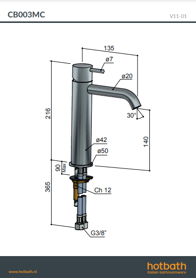 Cobber CB003MC wastafelmengkraan Hotbath H 216 mm x B (uitloop) 135 mm verkrijgbaar bij Stonecompany.nl.