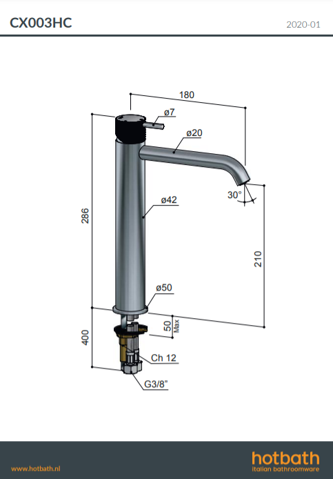 Cobber CX003HC wastafelmengkraan Hotbath H 286 mm x D 180 mm verkrijgbaar bij Stonecompany.nl.