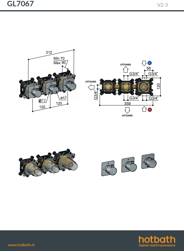 Gal GL7067 (+HBCB7067 inbouwdeel) inbouw douchethermostaat met 2 stopkranen Hotbath verkrijgbaar bij Stonecompany.nl.