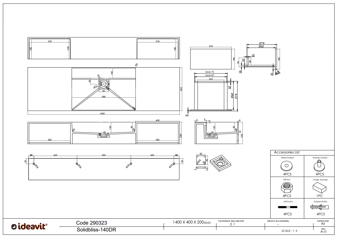 - Afmetingen: L1400 x B400 x H200 mm