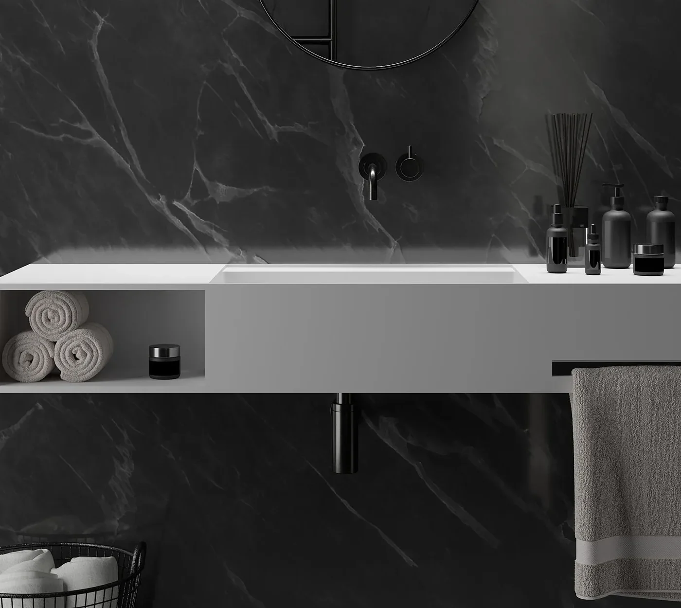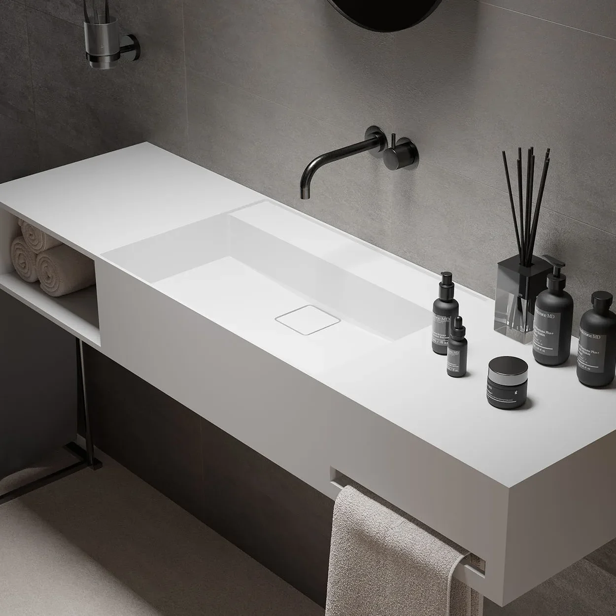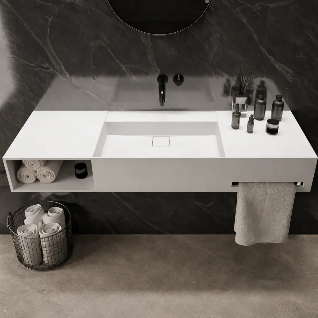 Wandwastafel van Solid Surface • Mat witte afwerking • Extra breed formaat • Afgeronde binnenhoeken • Zonder kraangat • Handdoekhouder rechts • Opbergvak links • Inclusief Solid Surface afvoerafdekking • Inclusief wandbevestigingsset • Minimalistisch en luxe design
