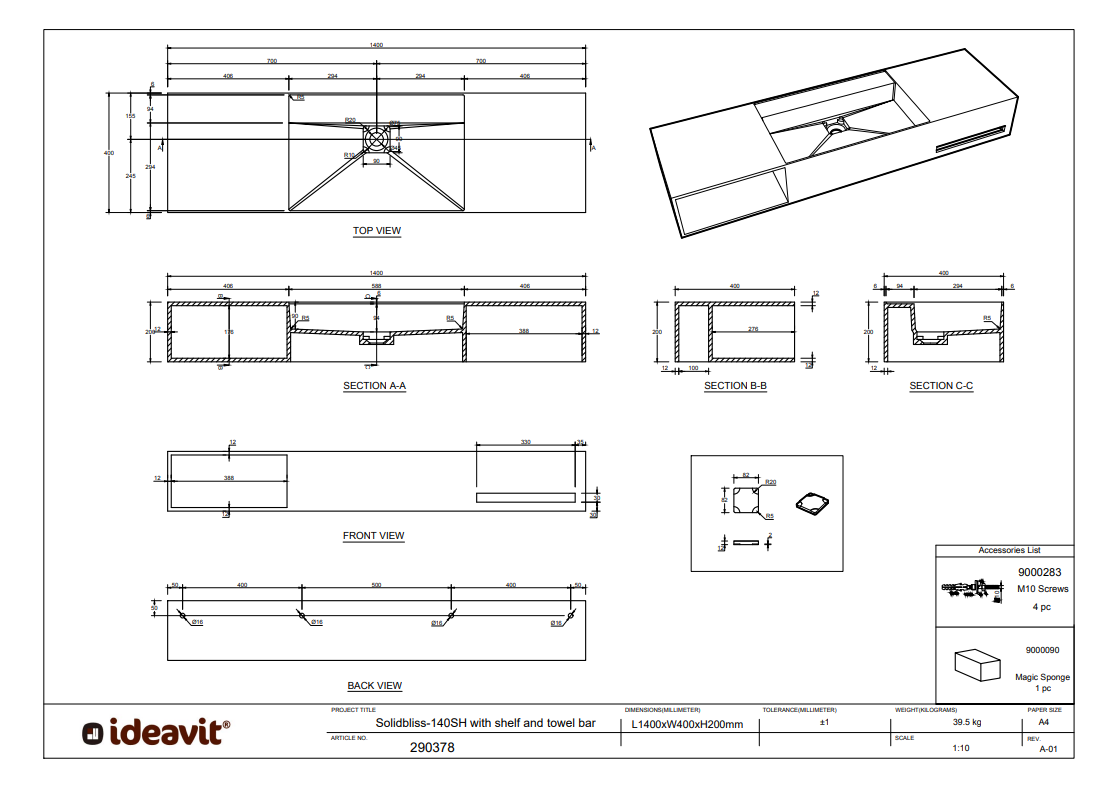 De Ideavit Solidbliss 140 SH mat wit wandwastafel is een strak vormgegeven wastafel, ontworpen voor verschillende type badkamers waarin design en functionaliteit samenkomen. Deze wastafel is uitgevoerd in solid surface met een matte witte afwerking en kenmerkt zich door de vormgegeven afgeronde binnenhoeken. De wastafel beschikt over een geïntegreerde handdoekhouder aan de rechterzijde en een praktisch opbergvak aan de linkerzijde, waardoor extra accessoires netjes uit het zicht blijven. Het model is uitgevoerd zonder kraangat en is daardoor ideaal te combineren met wandkranen of inbouwkranen. De wastafel wordt geleverd met een vierkante afvoerafdekking in Solid Surface wit mat en een complete wandbevestigingsset voor een stabiele en eenvoudige montage. Let op: de drainage voor verborgen afvoer is niet inbegrepen. Deze wastafel is te combineren met de SP700003 niet-afsluitbare open afvoer.