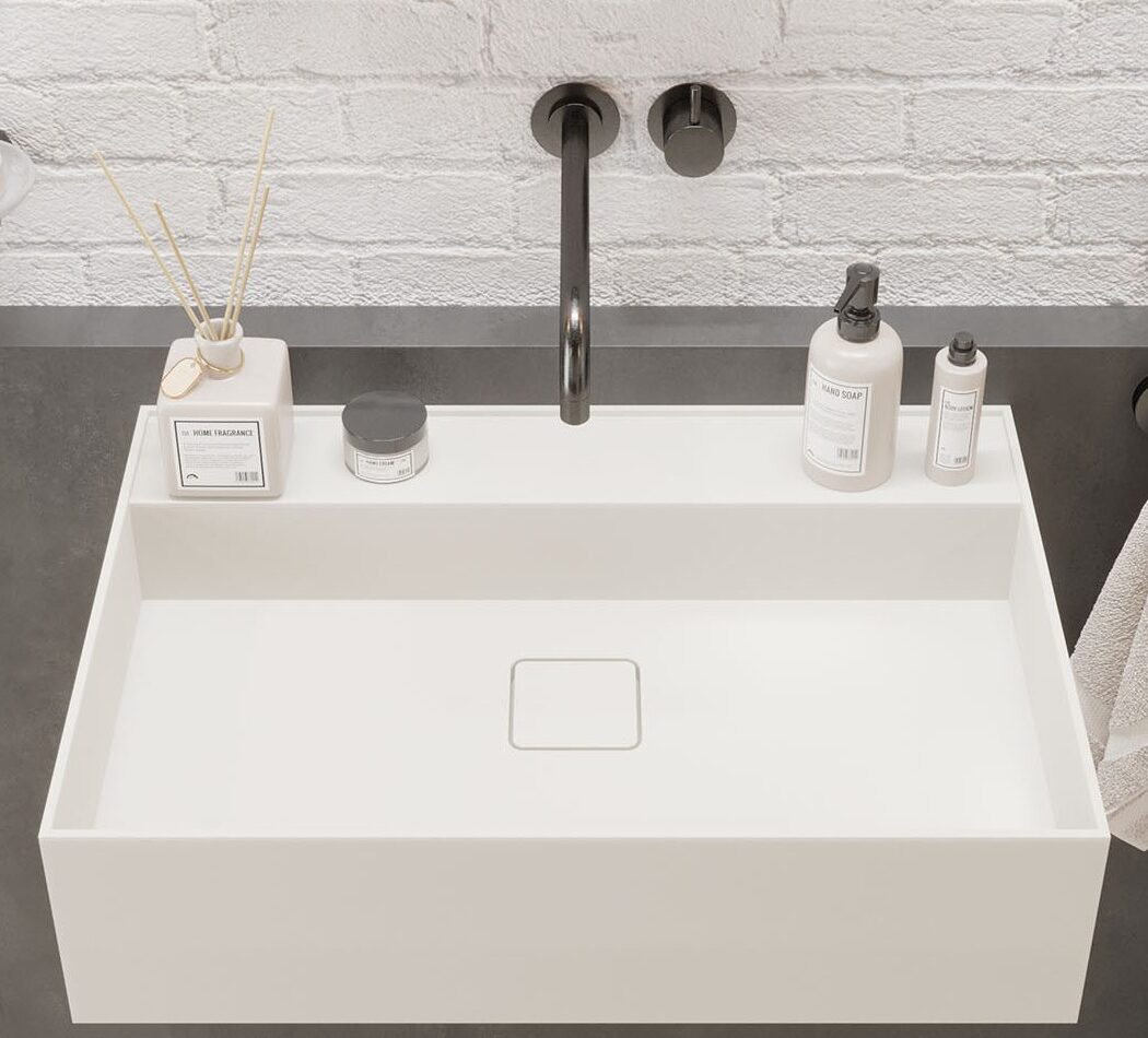 Wandwastafel van Solid Surface • Mat witte afwerking • Dunne randen • Afgeronde binnenhoeken • Zonder kraangat • Inclusief vierkante Solid Surface afvoerplaat • Inclusief muurbevestigingsset • Minimalistisch en verfijnd design