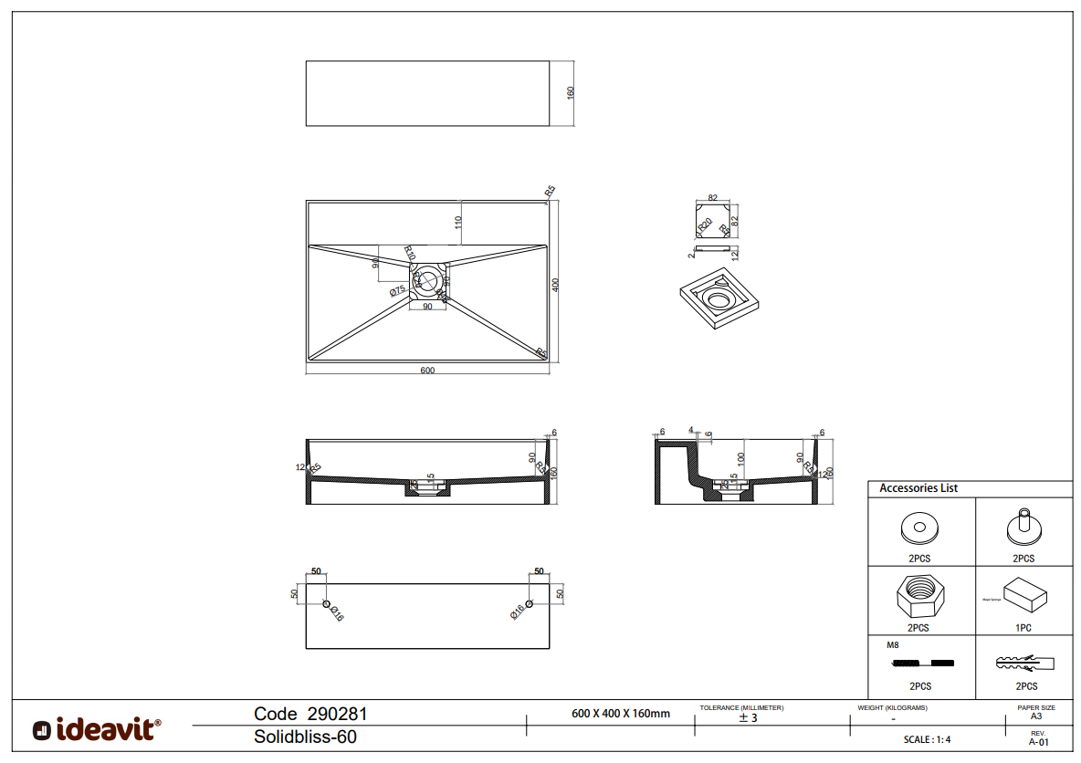 zonder kraangat en daarmee ideaal te combineren met wand- of inbouwkranen. De Solidbliss 60 wordt geleverd met een wit mat solid surface vierkante afvoerplaat en een complete muurbevestigingsset voor een strakke en stabiele montage. Let op: de drainage voor verborgen afvoer is niet inbegrepen. Deze wastafel is te combineren met de