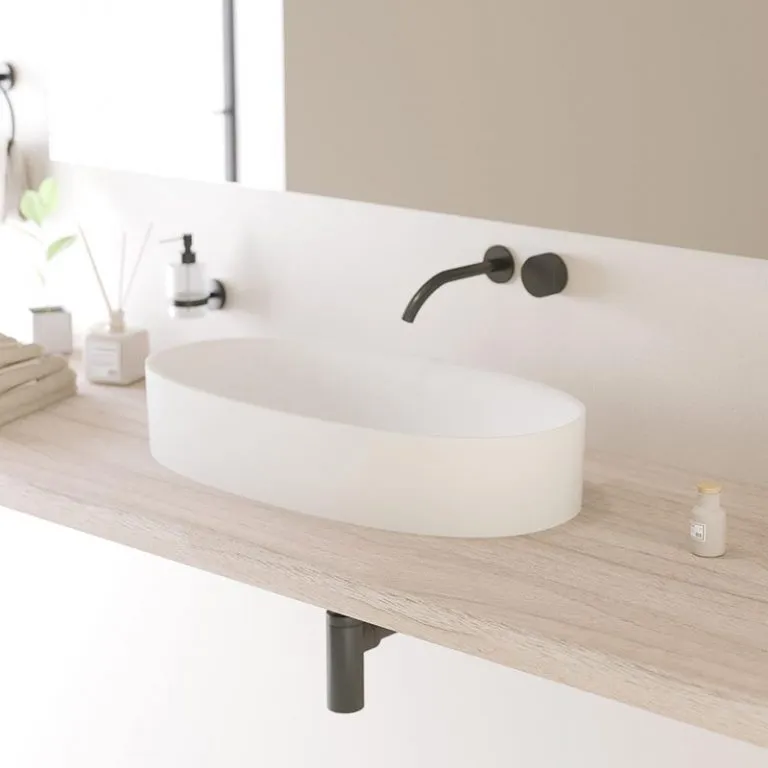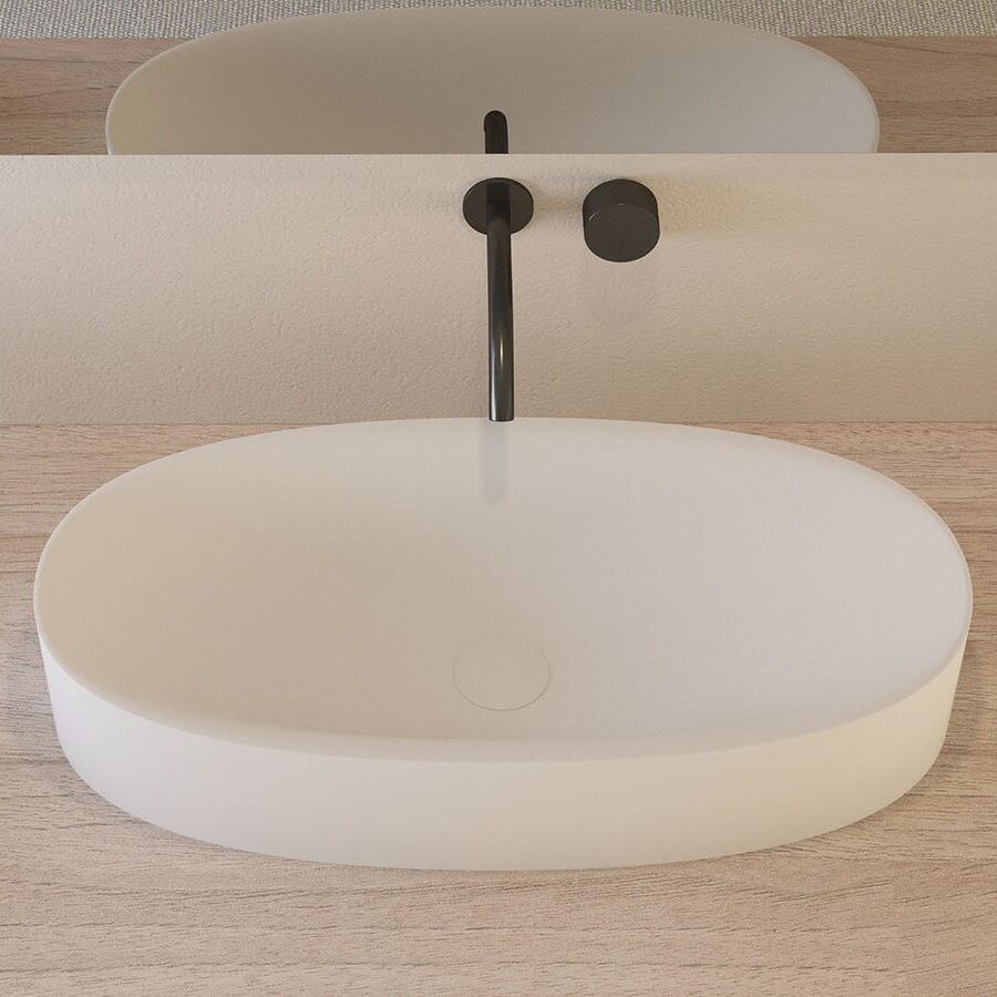Vrijstaande opzetwastafel • Uitvoering in Solid Surface mat wit • Beschikbaar in drie varianten (