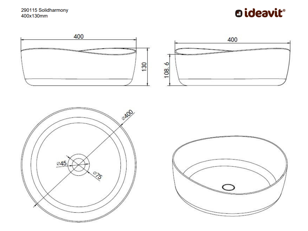 Ideavit Solidharmony 60 Solid Surface waskom • Mat wit uitgevoerd • Verkrijgbaar in Ø400 mm en Ø600 mm • Levering zonder pop-up afvoer • Te combineren met Click Plug 281148 of 281149-UNI • Minimalistisch en modern design • Hoogwaardige kwaliteit van Ideavit