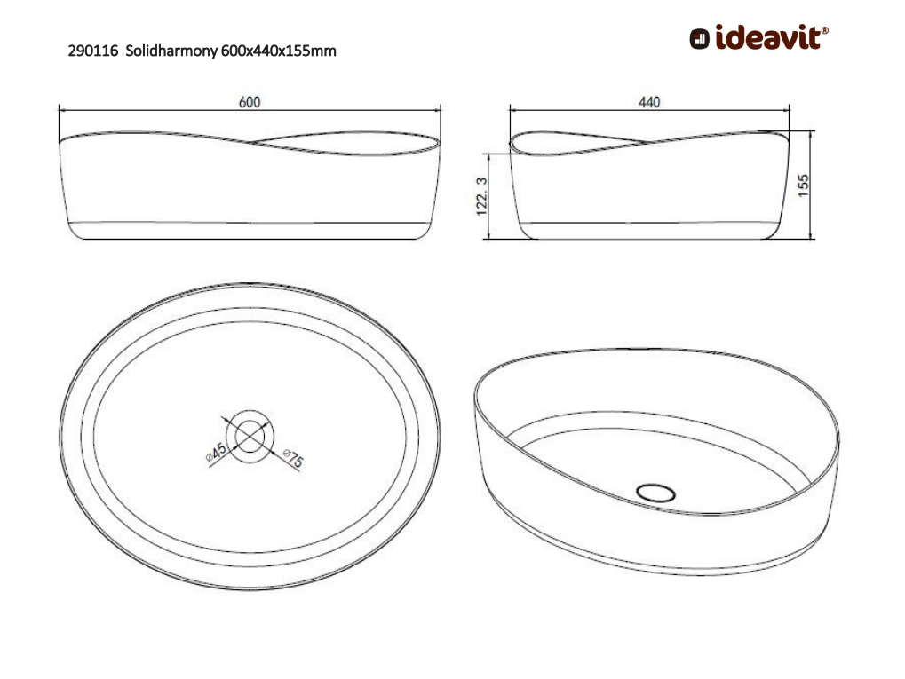 Solid Surface met een matte witte afwerking. Dankzij het minimalistische design en de ronde vormen past deze waskom perfect in moderne en luxe badkamers. De Solidharmony is verkrijgbaar in twee varianten: de compacte versie met een diameter van Ø400 mm (D400 x H130 mm) en de (grotere) versie met afmetingen Ø600 mm (L600 x B440 x H155 mm). Beide modellen worden geleverd zonder pop-up afvoer, maar zijn te combineren met de