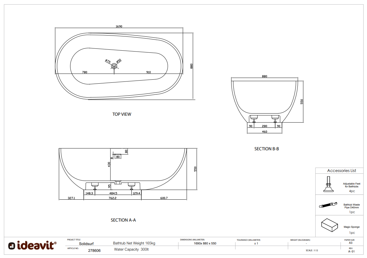 L1700 x B880 x H560 mm en de verstelbare poten is dit vrijstaande ligbad niet alleen stijlvol, maar ook praktisch en stabiel te installeren in iedere badkamer.