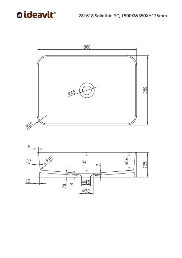 Vrijstaande ovale waskom • Uitvoering in solid surface mat wit • Compact formaat L500 x B350 x H125 mm • Wordt geleverd zonder pop-up afvoer • Te combineren met click plug pop-up afvoeren (281148 of 281149-UNI) • Minimalistisch en tijdloos design • Hoogwaardige kwaliteit van Ideavit