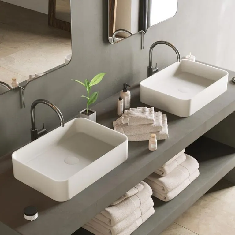 Ideavit Solidthin SQ vrijstaande waskom is een elegante opzetwastafel in een ovale vorm, uitgevoerd in