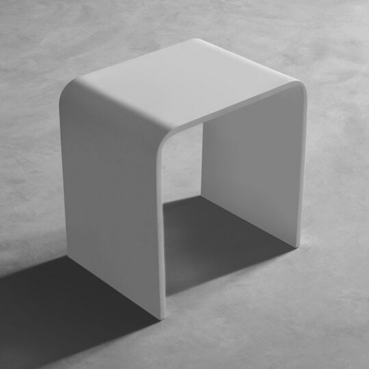 solid surface met een matte witte afwerking en past naadloos in moderne badkamers en wellnessruimtes. De kruk is volledig vrijstaand en kan flexibel worden geplaatst in de douche of badkamer.