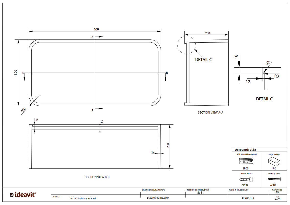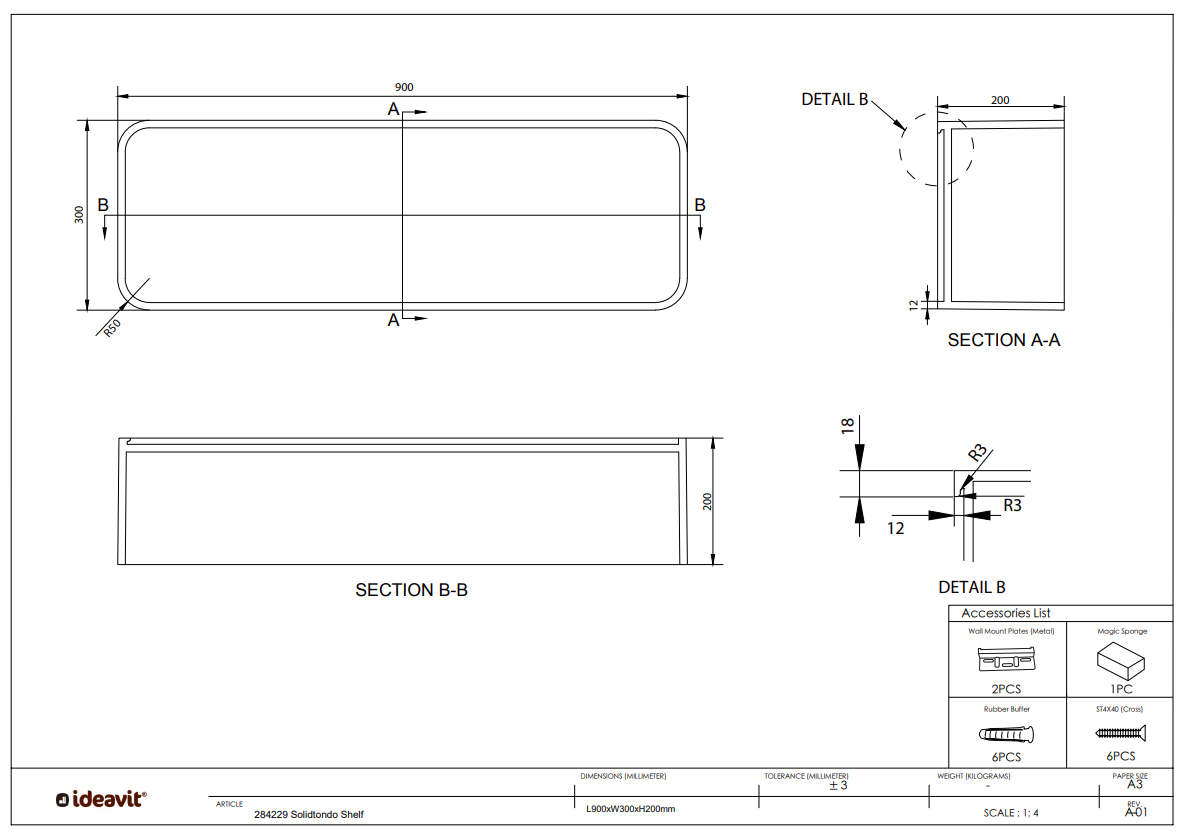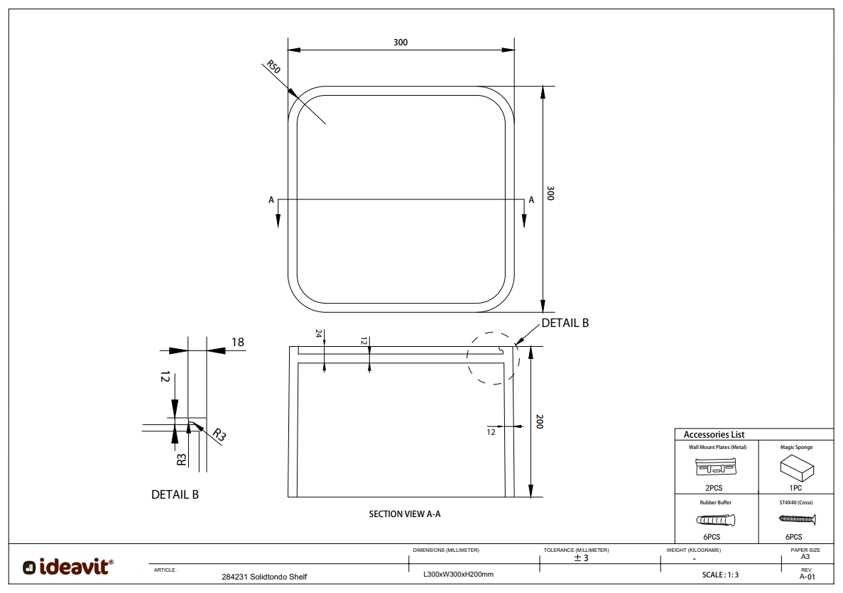 Ideavit SolidTondo 30 Wandplank (artikelcode 284231) met compacte afmetingen (L300 x B300 x H200 mm). Daarnaast is de SolidTondo ook leverbaar in grotere varianten:
