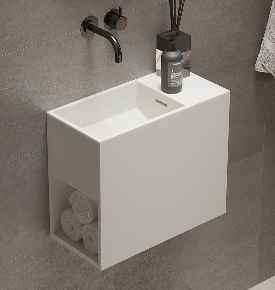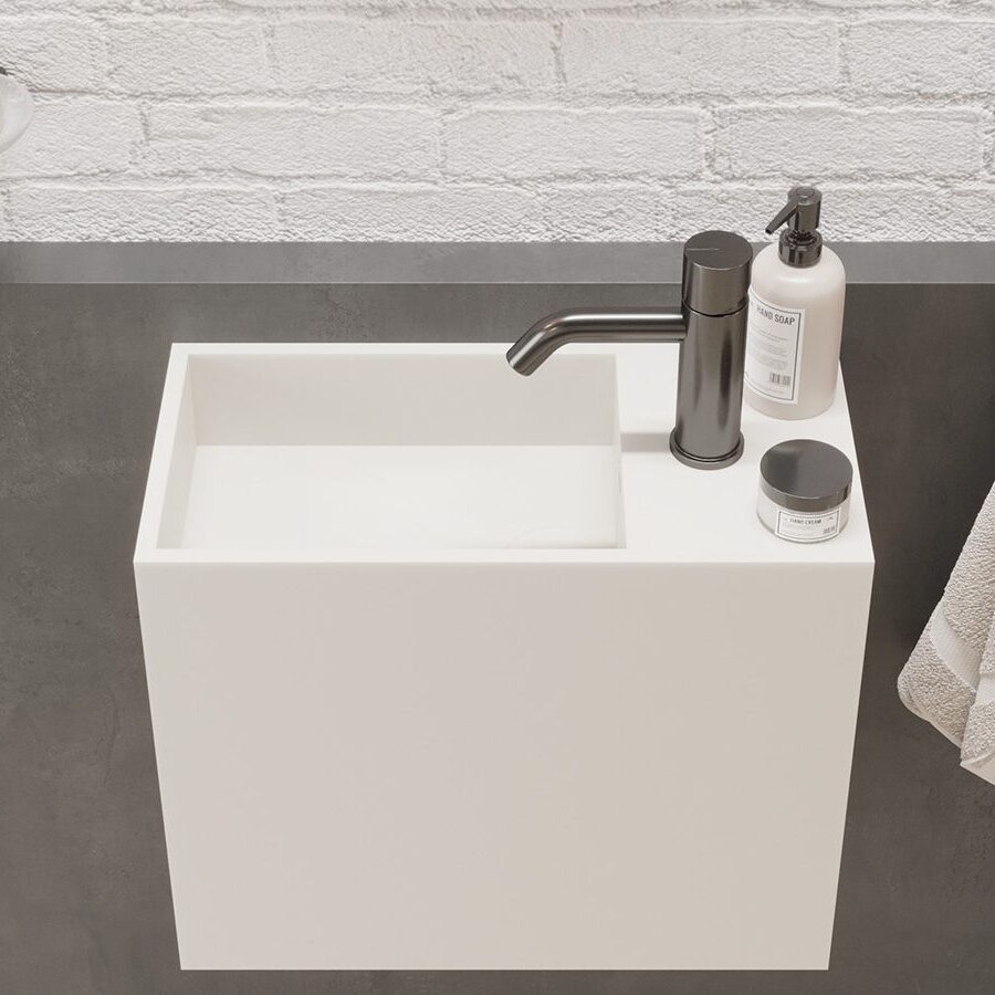 solid surface met een matte witte afwerking en is ontworpen voor moderne badkamers en stijlvolle toiletruimtes. De