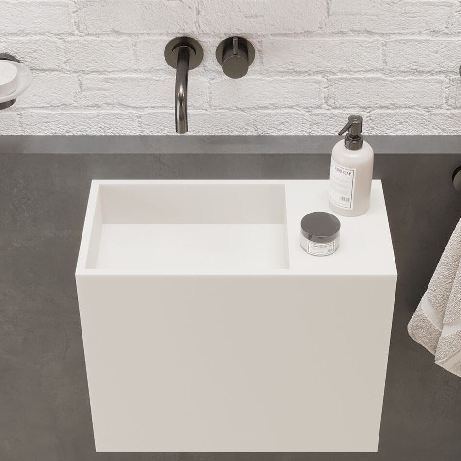 Wandwastafel van Solid Surface • Mat witte afwerking • Met kraangat (hoofdproduct) • Alternatief zonder kraangat leverbaar • Links en rechts omkeerbaar • Voorzien van overloopgat en plateau • Inclusief handdoekstang • Inclusief muurbevestigingsset • Minimalistisch en modern design