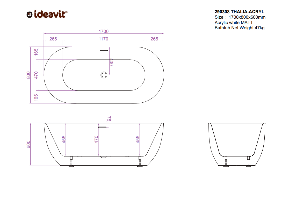 Het Ideavit Thalia acryl mat wit vrijstaand bad combineert modern design met dagelijks comfort. Gemaakt van mat wit acryl, straalt dit bad tijdloze elegantie uit en vormt het een echte blikvanger in iedere badkamer. De Thalia is voorzien van een geïntegreerd overloopgat en wordt geleverd inclusief pop-up afvoer met acryl mat witte afdekplaat en afvoerslang. Dankzij de royale afmetingen van L1700 x B800 x H600 mm biedt dit bad een comfortabele en ontspannende ligervaring.