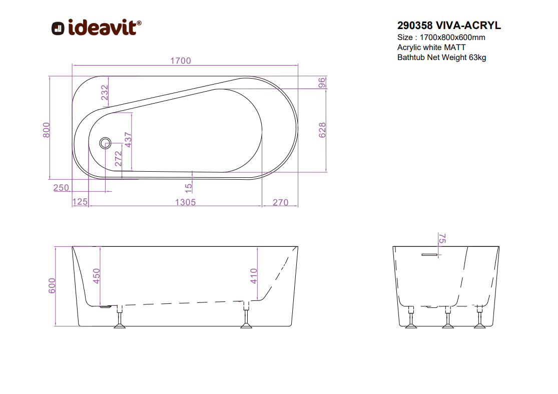 Ideavit Viva acryl mat wit vrijstaand bad is een elegante badkuip die luxe en comfort samenbrengt. Uitgevoerd in mat wit acryl biedt dit bad een tijdloze uitstraling die perfect aansluit bij moderne en minimalistische badkamers. De Viva is voorzien van een geïntegreerd