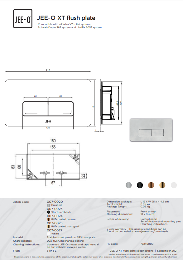 JEE-O drukplaat XT, dual flush spoelmechaniek rvs geschikt voor alle WISA XT toilet reservoir inbouwtechniek (lengte 21cm) verkrijgbaar bij