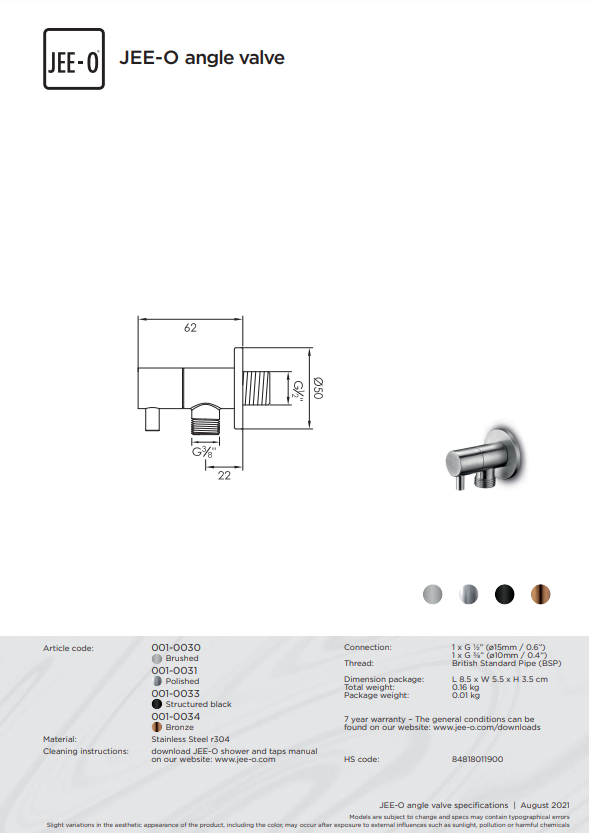 De JEE-O hoek stopkraan zijn verkrijgbaar in de kleuren: