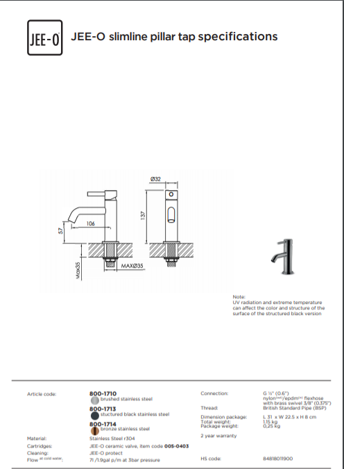 De Slimline fonteinkraan JEE-O is verkrijgbaar in de kleuren: