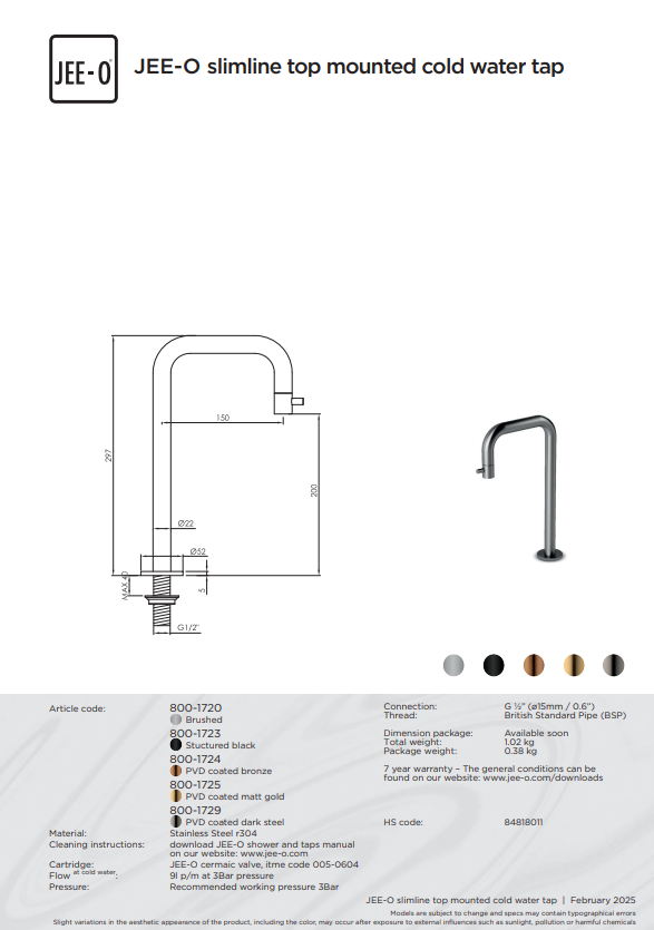 De Slimline fonteinkraan JEE-O is verkrijgbaar in de kleuren: