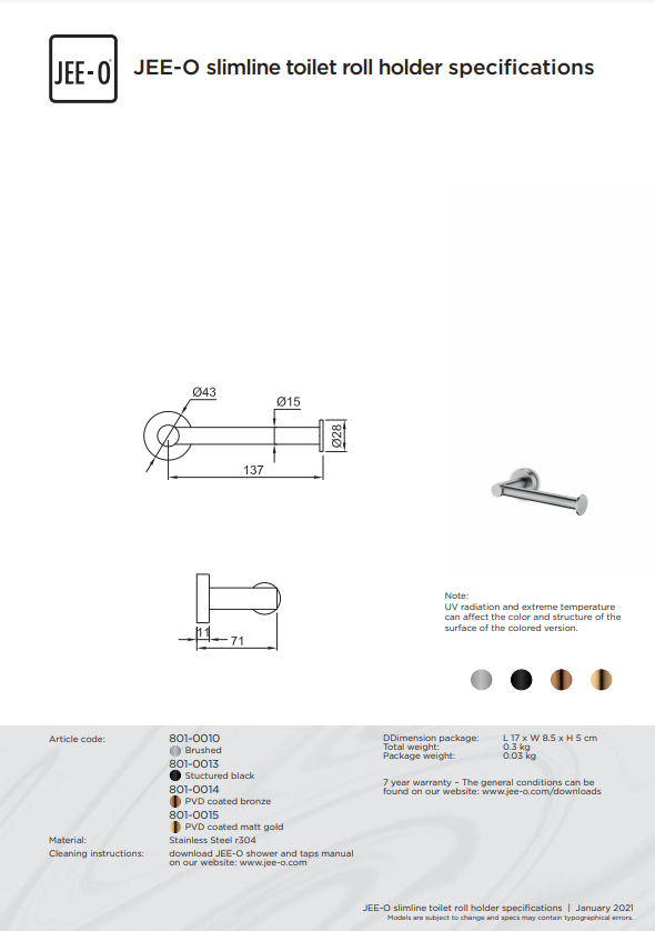 De Slimline toiletrolhouder JEE-O is verkrijgbaar in de kleuren: