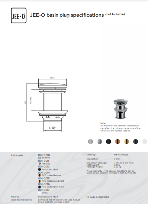 De JEE-O wastafelplug rvs, niet afsluitbaar is verkrijgbaar in de kleuren: