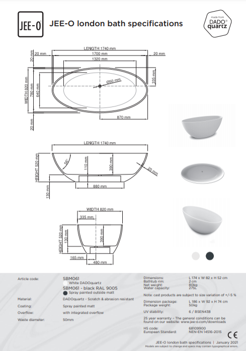 London bad JEE-O, het is een vrijstaand bad gemaakt van DADOquartz. Het heeft een geïntegreerde overloop. Het bad is kenmerkend vanwege het luxe design. Het bad verrijkt iedere badkamer vanwege het mooie design. De afmetingen zijn L 174 x B 82 x H 52 cm. Nu verkrijgbaar bij Stone Company.