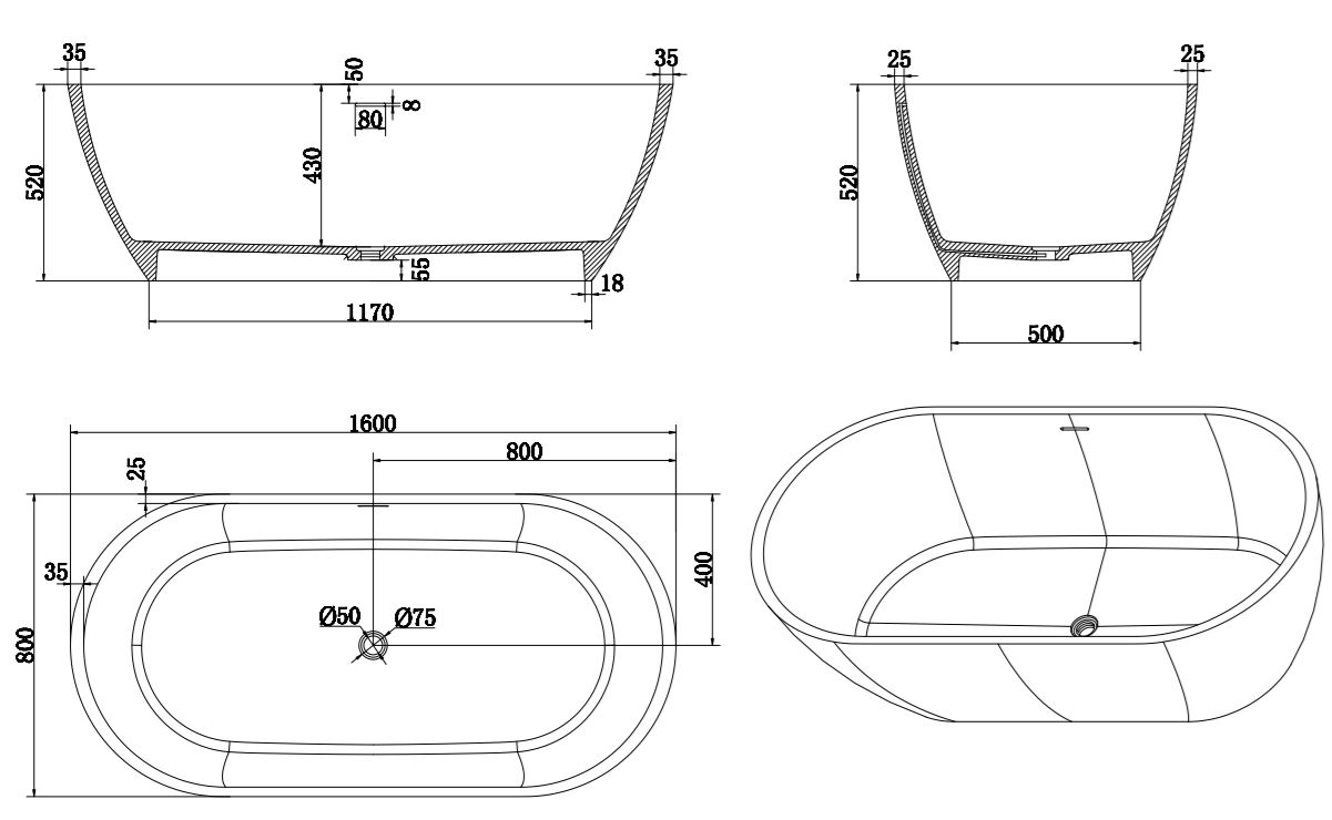 Luca Vasca bad LUVA1600 van Luca Sanitair, vrijstaand bad solid surface met overloop, 160x80x54h 174kg incl. Viega afvoerset klikplug chroom, sifon met flex afvoerpijp 40/50mm (sifon steekt 7cm uit). Verkrijgbaar bij