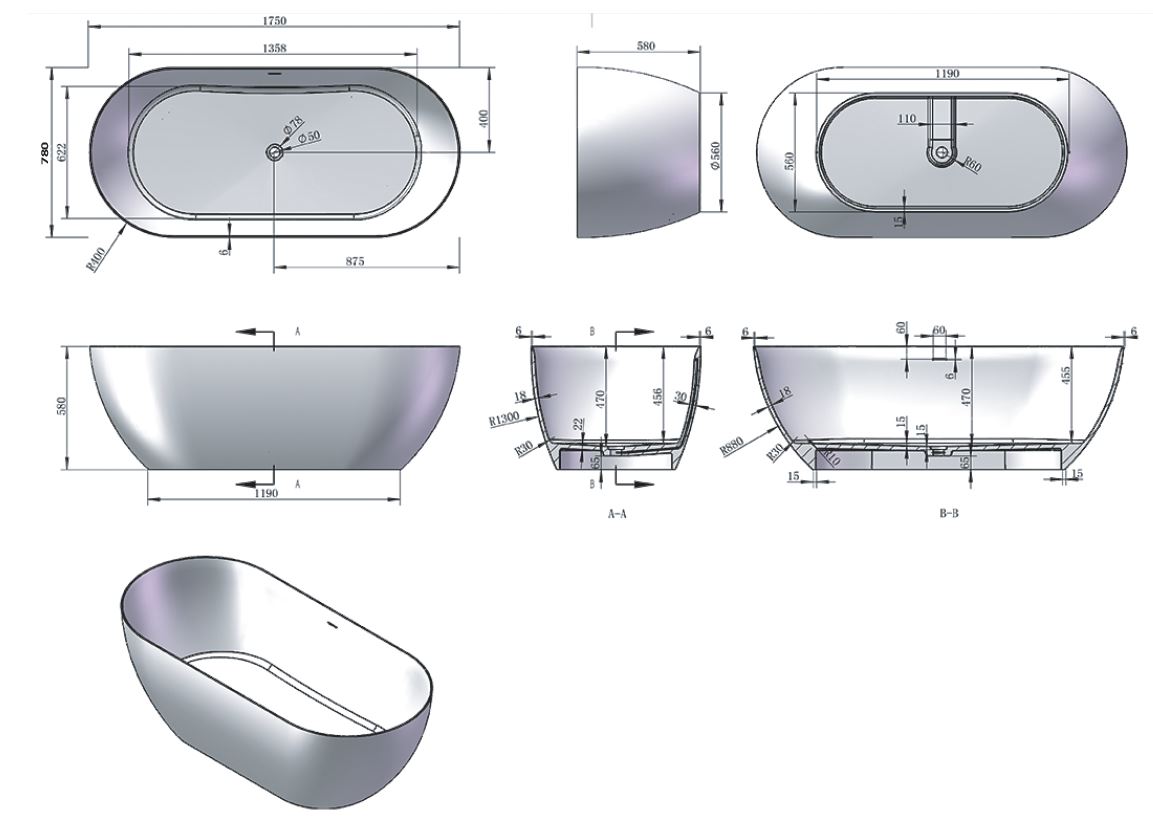 Luca Vasca bad LUVA1750 van Luca Sanitair, vrijstaand bad met dunne rand van mineral stone met overloop, 175x80x58h 140kg incl. Viega afvoerset klikplug chroom, sifon met flex afvoerpijp 40/50mm (sifon steekt 5cm uit). Verkrijgbaar bij Stone Company.