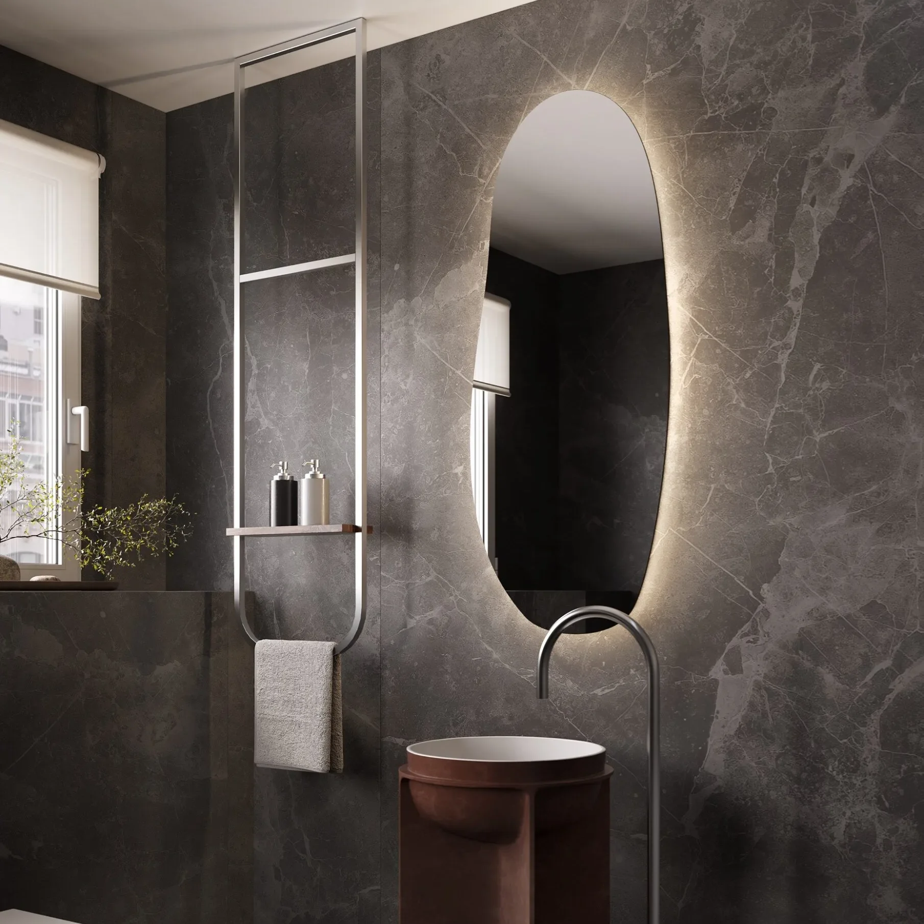 De Martens Design Amsterdam LED badkamerspiegel is een eigentijdse spiegel die organische vormen combineert met moderne functionaliteit. Dankzij de indirecte verlichting rondom ontstaat een warme en uitnodigende sfeer, perfect voor de badkamer maar ook stijlvol in slaapkamers of hallen. Voor extra gebruiksgemak is de spiegel voorzien van een dimbare infraroodsensor en geïntegreerde spiegelverwarming, zodat het glas altijd helder blijft, zelfs in vochtige ruimtes. De Amsterdam spiegel is beschikbaar in diverse afmetingen en past daardoor moeiteloos in uiteenlopende interieurstijlen. Met zijn duurzame materialen en hoogwaardige afwerking is dit een stijlvolle keuze voor iedereen die design en comfort wil combineren. De AMSTERDAM spiegel is verkrijgbaar in de afmeting: 500 x Ø1000 mm. Daarmee is er altijd een passend formaat voor zowel kleinere badkamers als ruime interieurs. Het strakke design maakt de spiegel een blikvanger die perfect aansluit bij moderne en luxe badkamers.