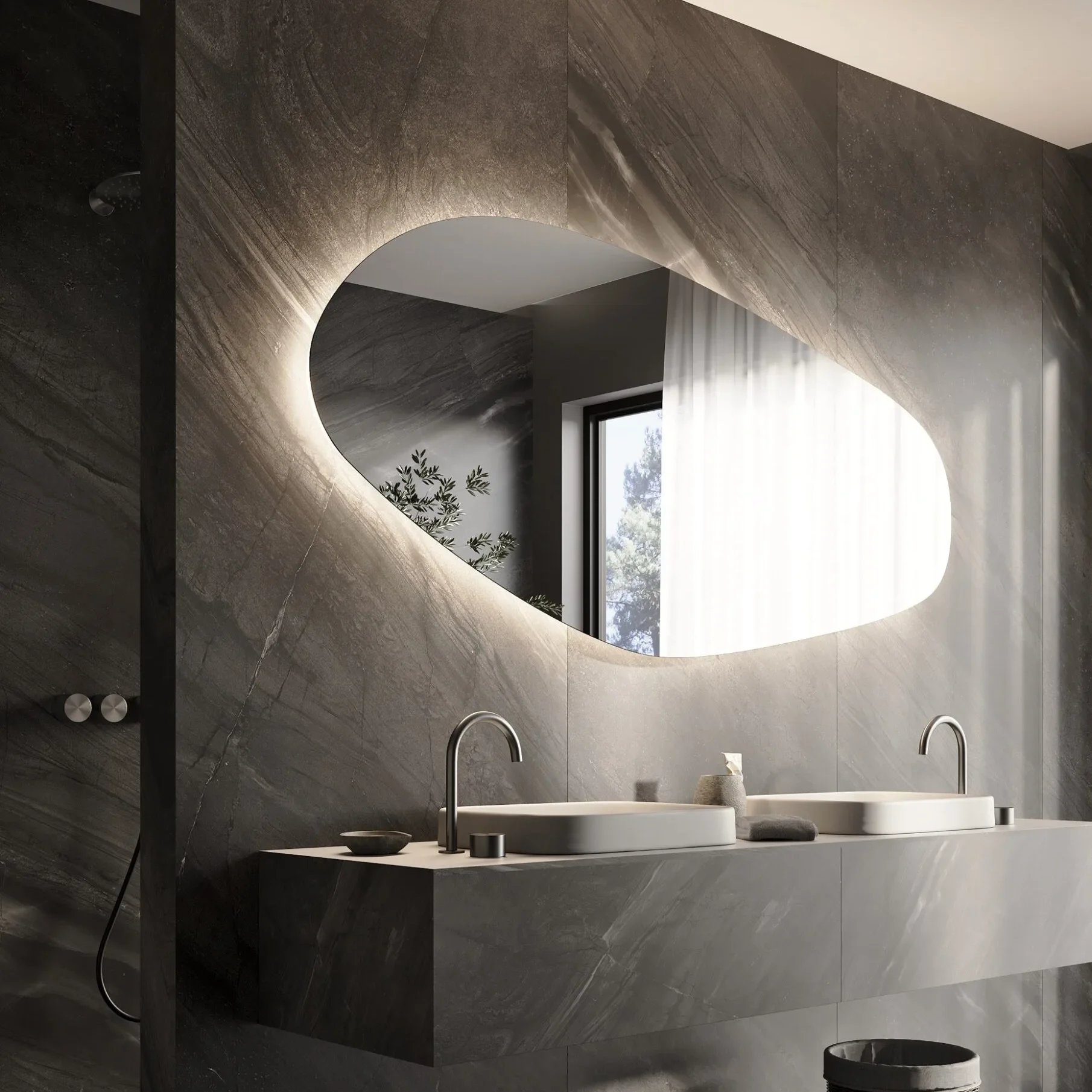 Martens Design IZMIR spiegel is een organisch vormgegeven designspiegel met indirecte LED-verlichting, dimbare sensor en spiegelverwarming, geschikt voor badkamer én woonruimtes zoals slaapkamer, hal of woonkamer.