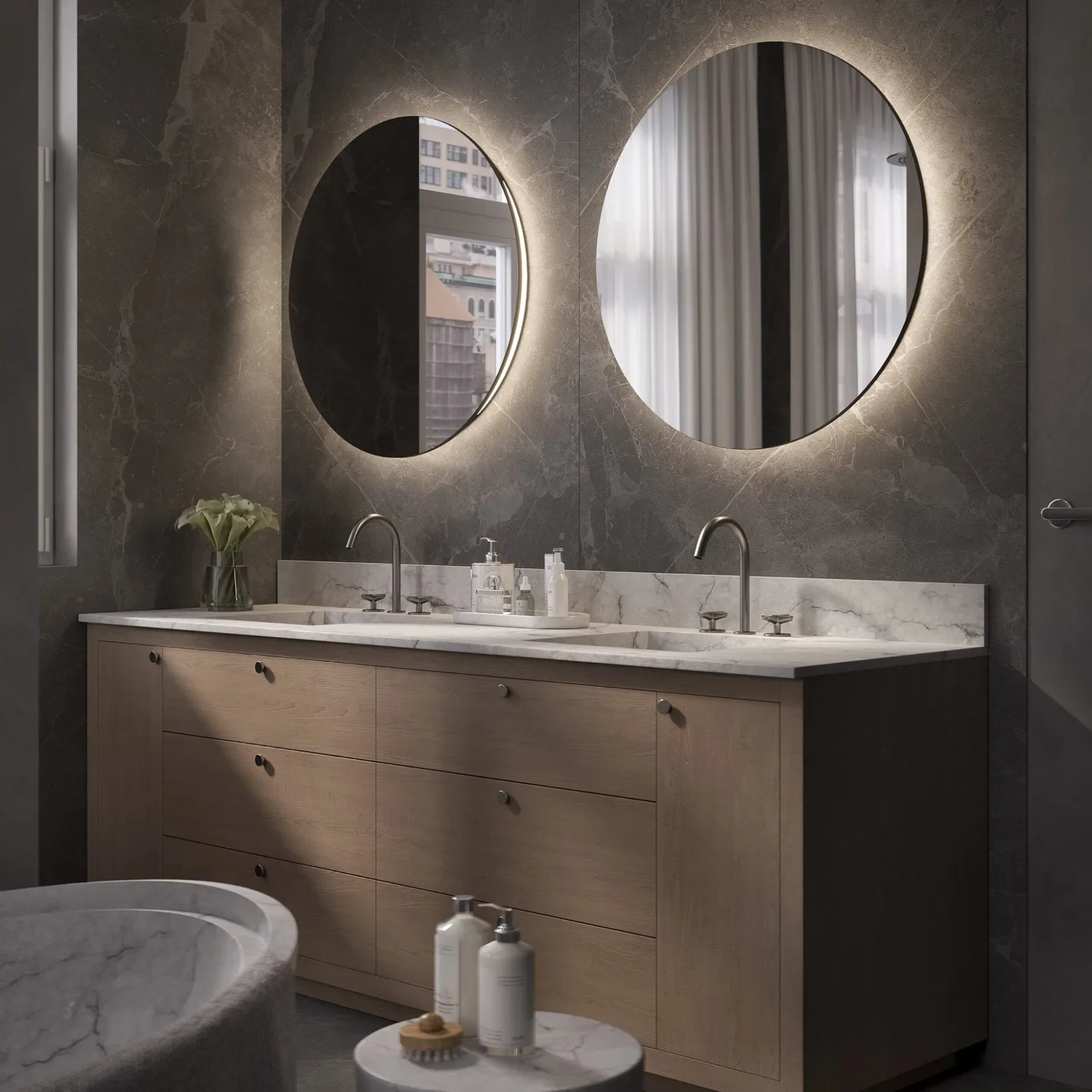 Ronde badkamerspiegel • Indirecte LED-verlichting rondom • Optionele spiegelverwarming • Dimbare sensoren voor lichtregeling • Maatwerk tot Ø1200 mm • Uit te breiden met Bluetooth-audio, digitale klok en zandstraalopties