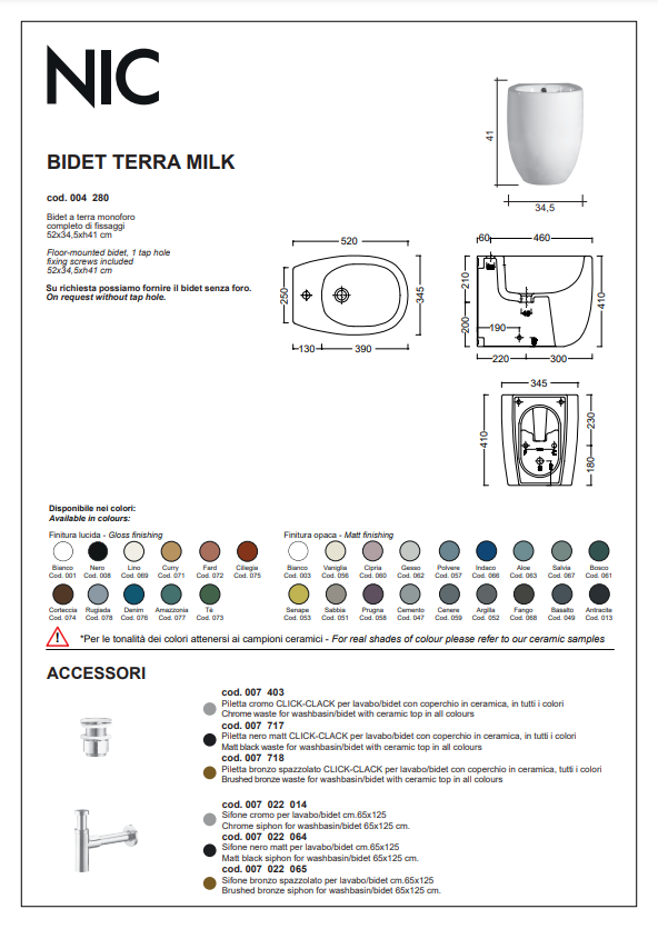Dit hoogwaardige staande Bidet uit de Milk collectie is gemaakt uit hoogwaardig keramiek. De afmeting van de lengte is 520 mm en heeft een breedte van 345 mm met een hoogte van 410 mm. Met een vloer installatie en een gewicht van 19 kg biedt het toilet stabiliteit en stevigheid. Het Milk wand bidet is beschikbaar in diverse kleuren, waaronder glans wit, mat wit, mat zwart, argilla, en maar liefst 27 andere kleuren. Dankzij het geïntegreerde hygiënesysteem blijft het bidet extra schoon en fris. Het Milk staand bidet wordt geleverd met een garantie van 2 jaar en heeft een levertijd van 3 tot 5 weken.