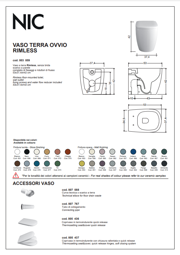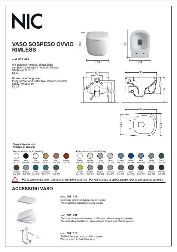 De NIC Design toiletzitting is gemaakt van keramiek. De toiletzitting komt uit de Ovvio collectie. Het Rimless ontwerp, maakt het schoonmaken van het toilet eenvoudiger. De zelf sluitende toiletbril met soft-closing systeem zorgt voor extra comfort en voorkomt harde klappen. Dit toiletzitting is verkrijgbaar in diverse kleuren, waaronder glans wit, mat wit, mat zwart, argilla, en maar liefst 27 andere kleuren. Met een levertijd van 3 tot 5 weken en 2 jaar volledige garantie, is dit toilet een uitstekende keuze voor elke moderne badkamer.