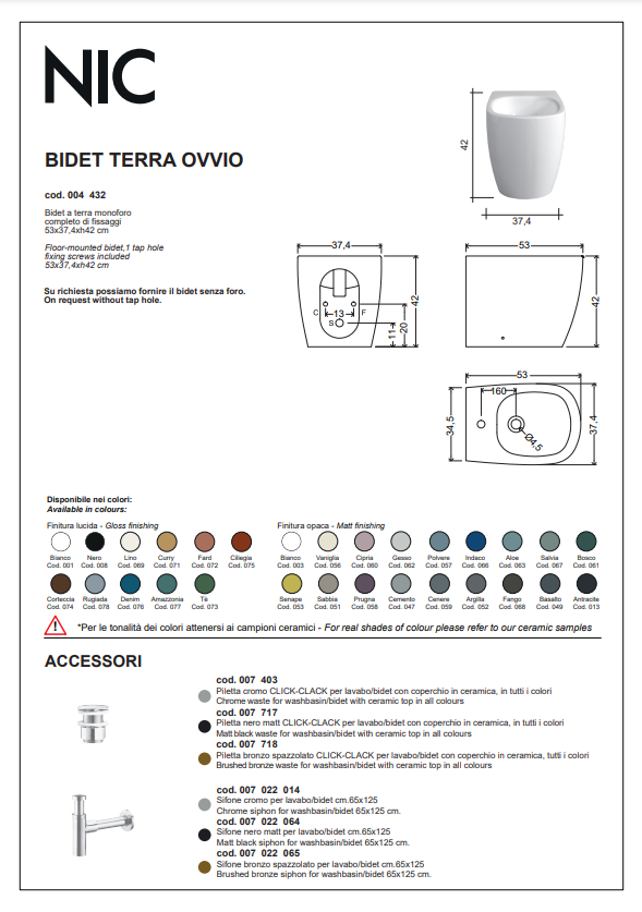 Dit hoogwaardige NIC Bidet staand uit de Ovvio collectie is gemaakt uit hoogwaardig keramiek. De afmeting van de lengte is 530 mm en heeft een breedte van 374 mm met een hoogte van 420 mm. Met een vloer installatie en een gewicht van 28 kg biedt het toilet stabiliteit en stevigheid. Het Milk wand bidet is beschikbaar in diverse kleuren, waaronder glans wit, mat wit, mat zwart, argilla, en maar liefst 27 andere kleuren. Dankzij het geïntegreerde hygiënesysteem blijft het bidet extra schoon en fris. Het Ovvio staand bidet wordt geleverd met een garantie van 2 jaar en heeft een levertijd van 3 tot 5 weken.