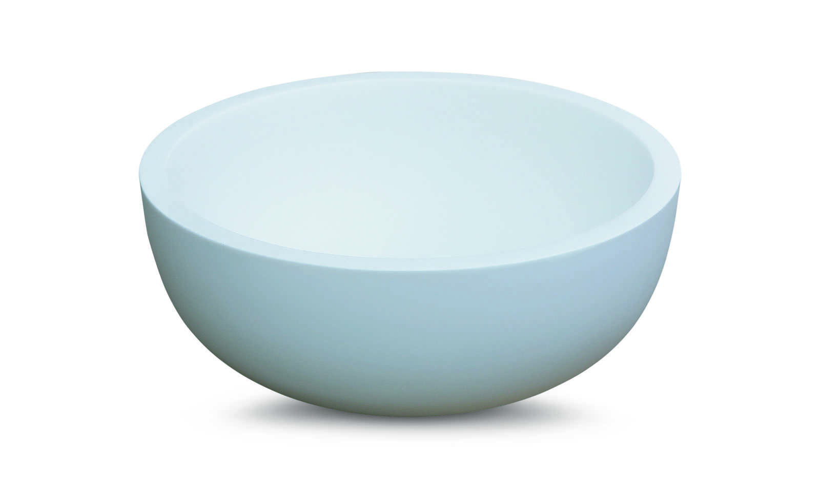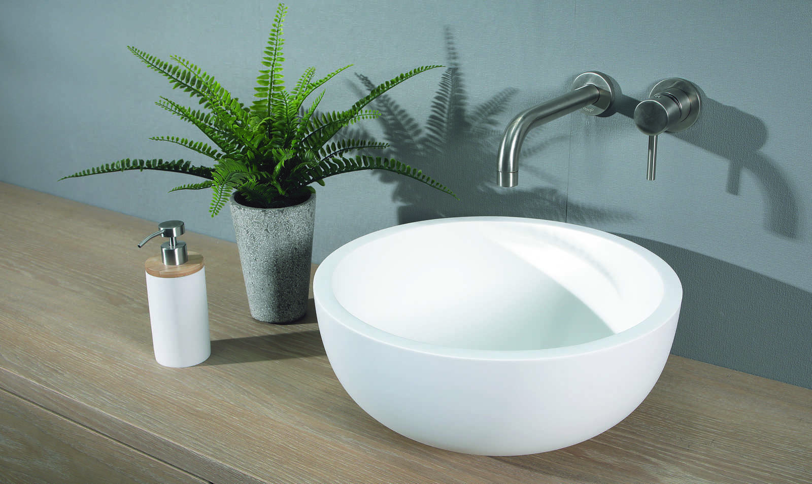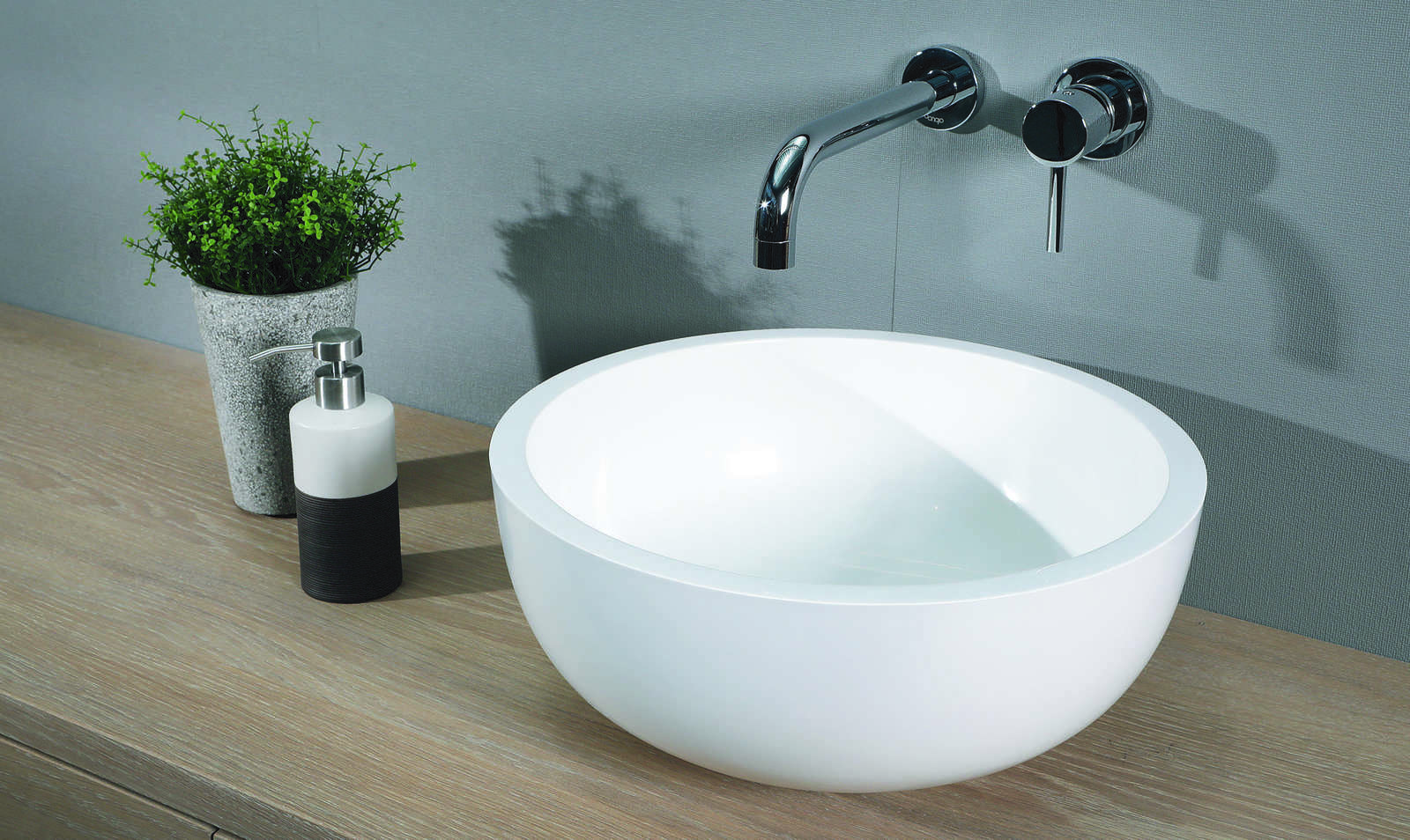 Opzetwastafel LUVA1301 wit glans en de LUVA1301M Wit mat, Luca Sanitair opzetwastafel gemaakt van mineral stone en solid surface. Vorm rond 39,5x39,5x17h verkrijgbaar bij