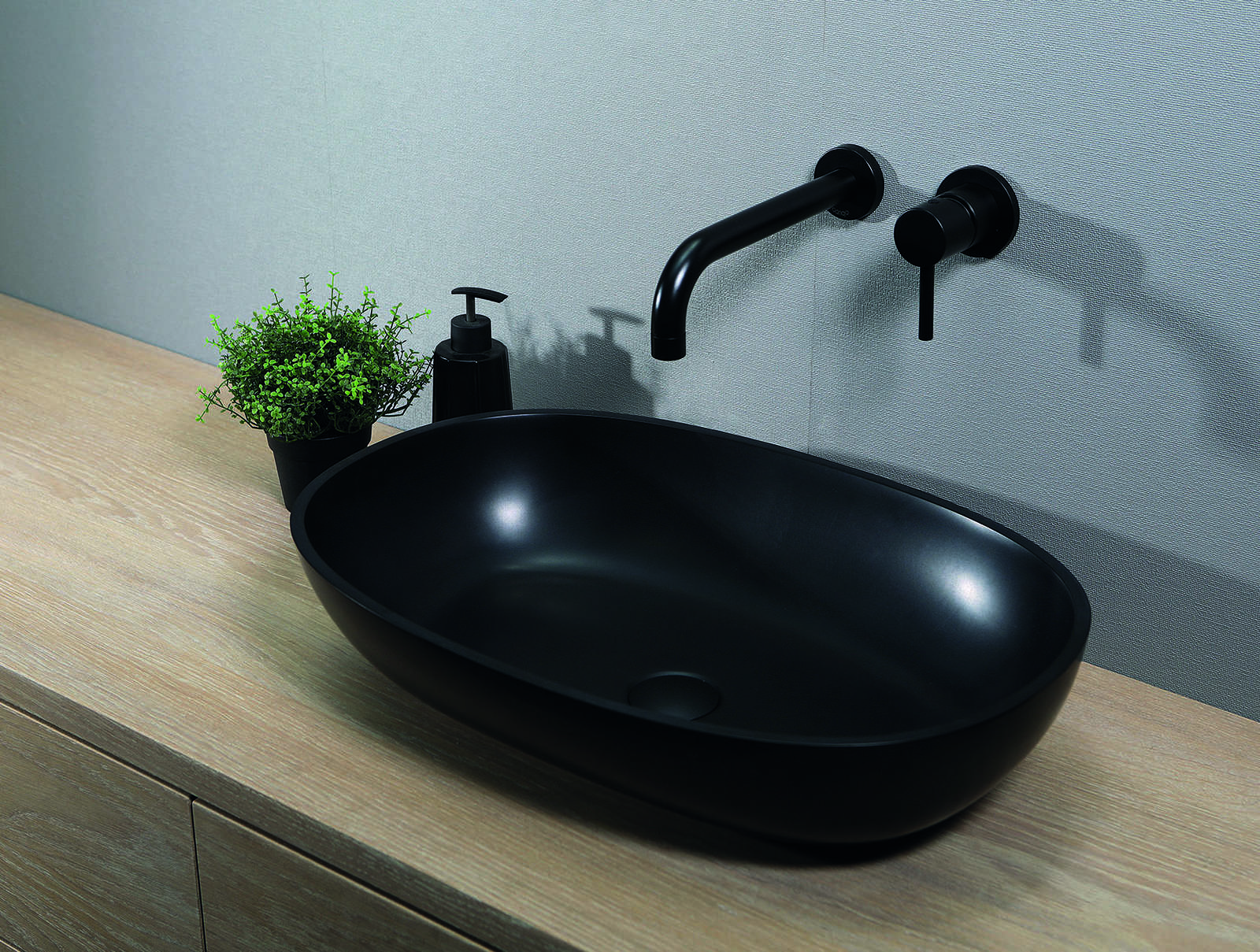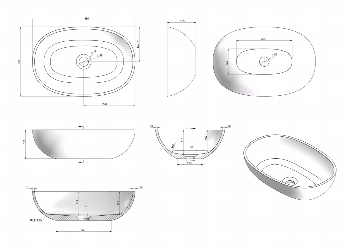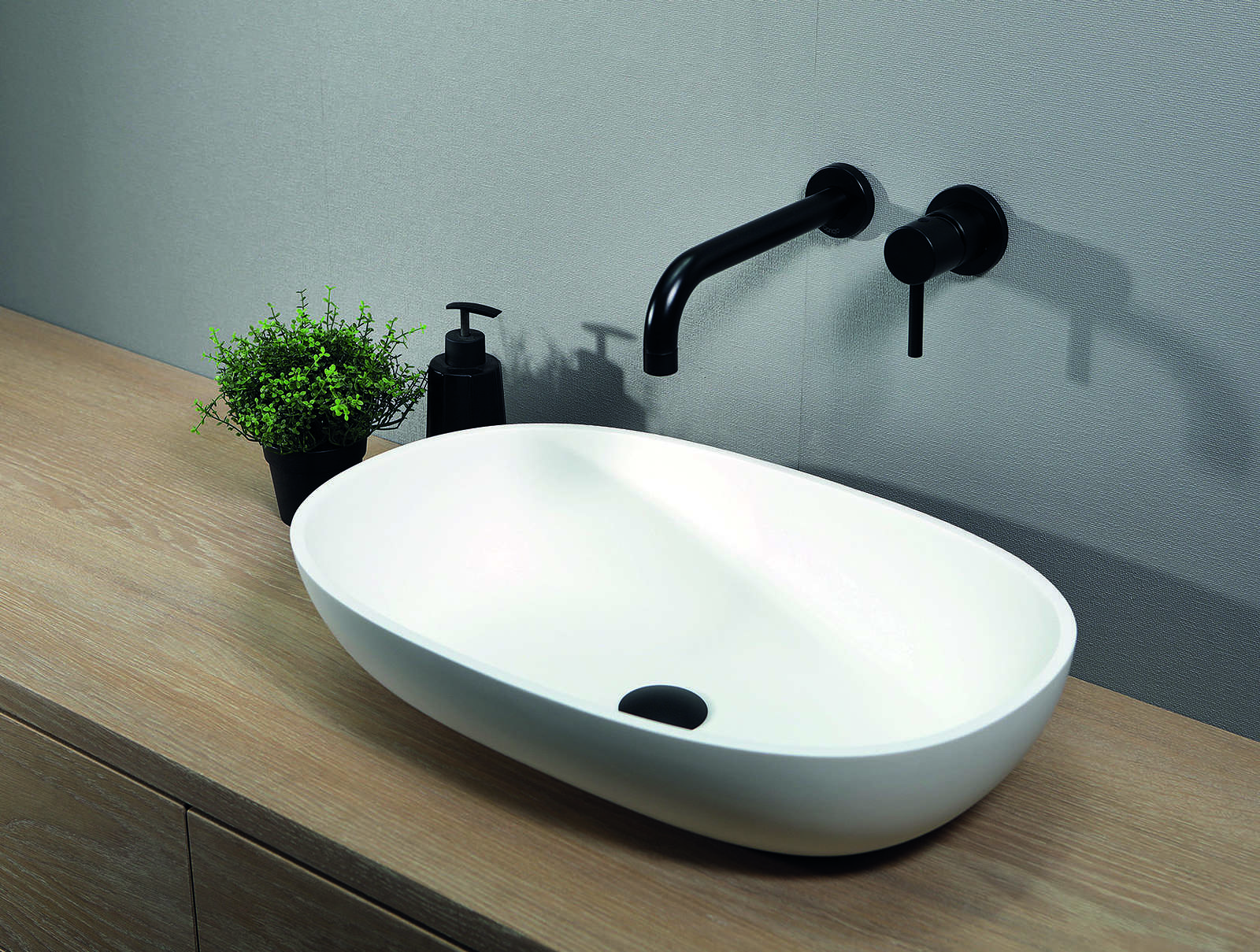 Opzetwastafel LUVA1306 wit glans, LUVA1306M wit mat en de LUVA1306A antraciet mat, Luca Sanitair opzetwastafel gemaakt van mineral stone. Vorm ovaal 57x32,5x13,5h, rand dikte 1cm verkrijgbaar bij