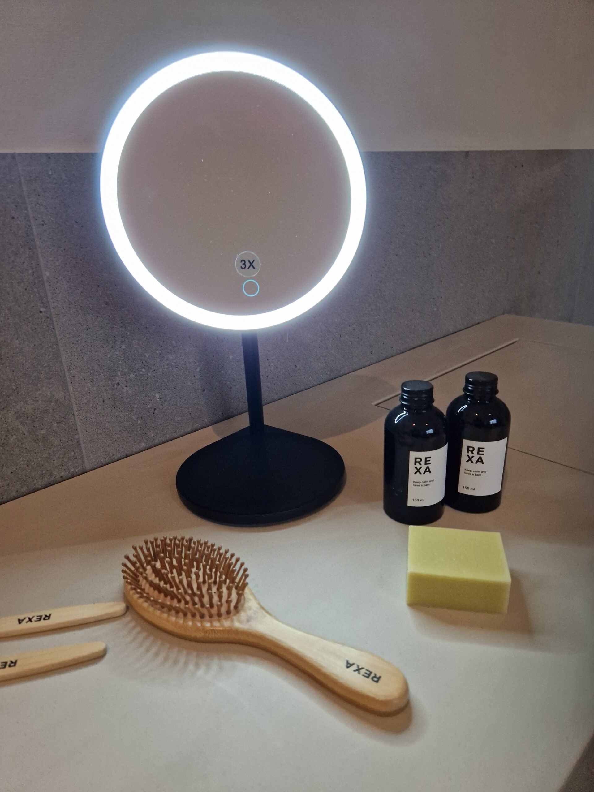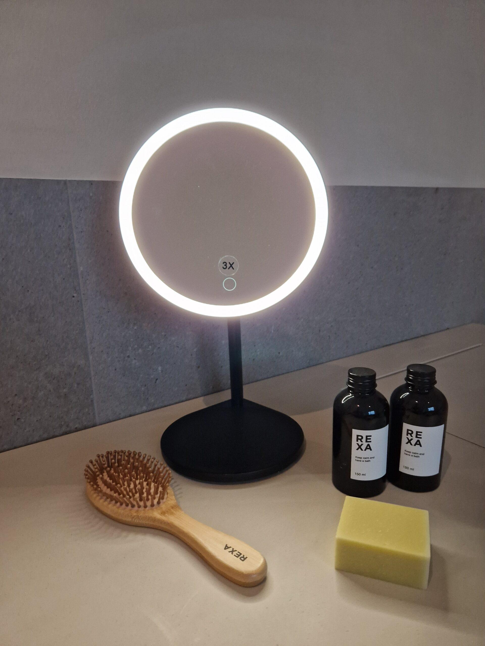 De REXA Lens spiegel heeft een 3x vergroting, zo kunt u gedetailleerd te werk gaan. De spiegel heeft een stevige, voet van metaal en PVC en heeft een mat zwarte kleur. Met de zuignap bevestig je de spiegel makkelijk op glas of andere spiegels. Met de touch-sensor kunt u het licht aanzetten en de felheid aanpassen naar keuze. Daarnaast kunt u ook de hoek van de spiegel aanpassen. De batterij van deze make-up spiegel gaat lang mee en is eenvoudig op te laden met een USB-kabel.