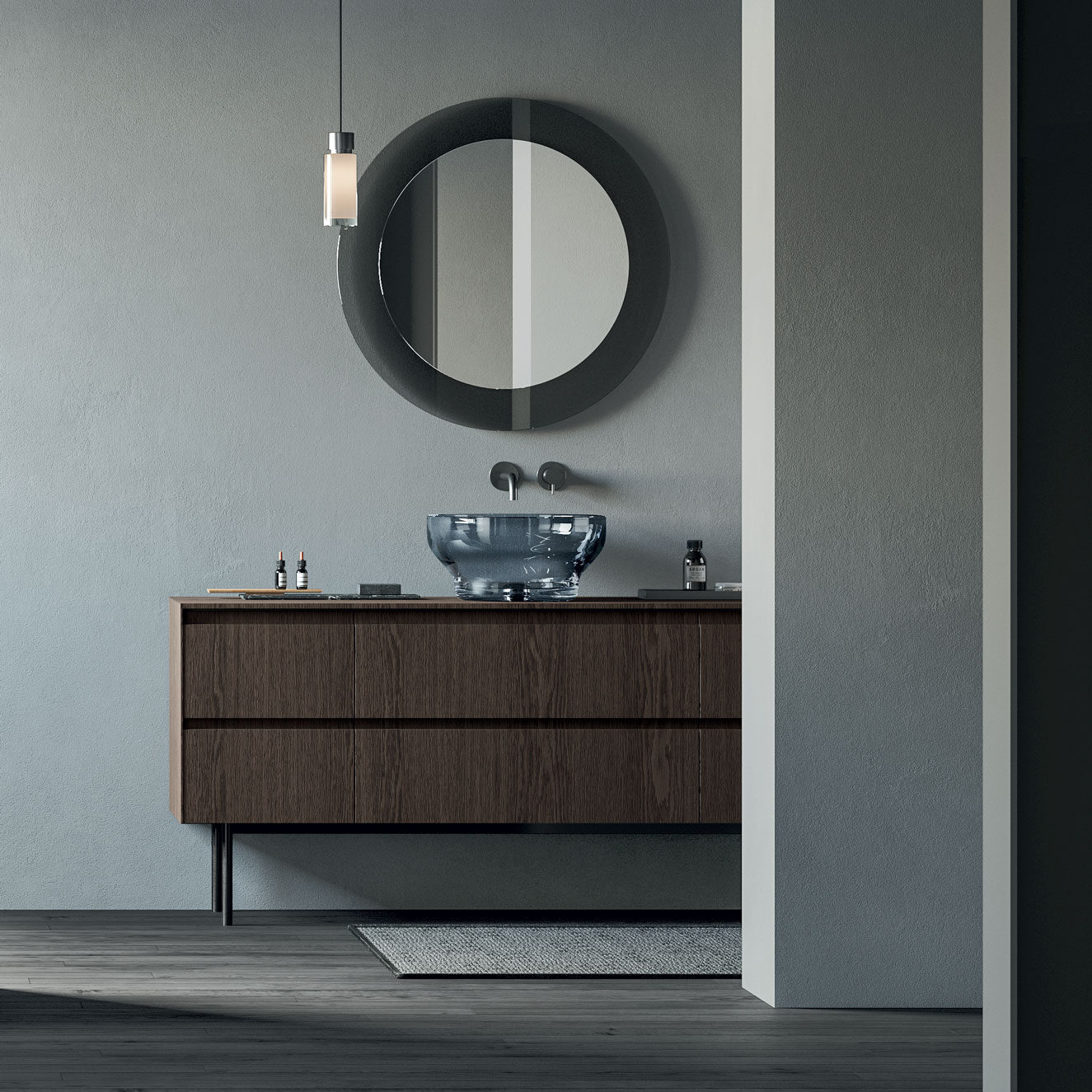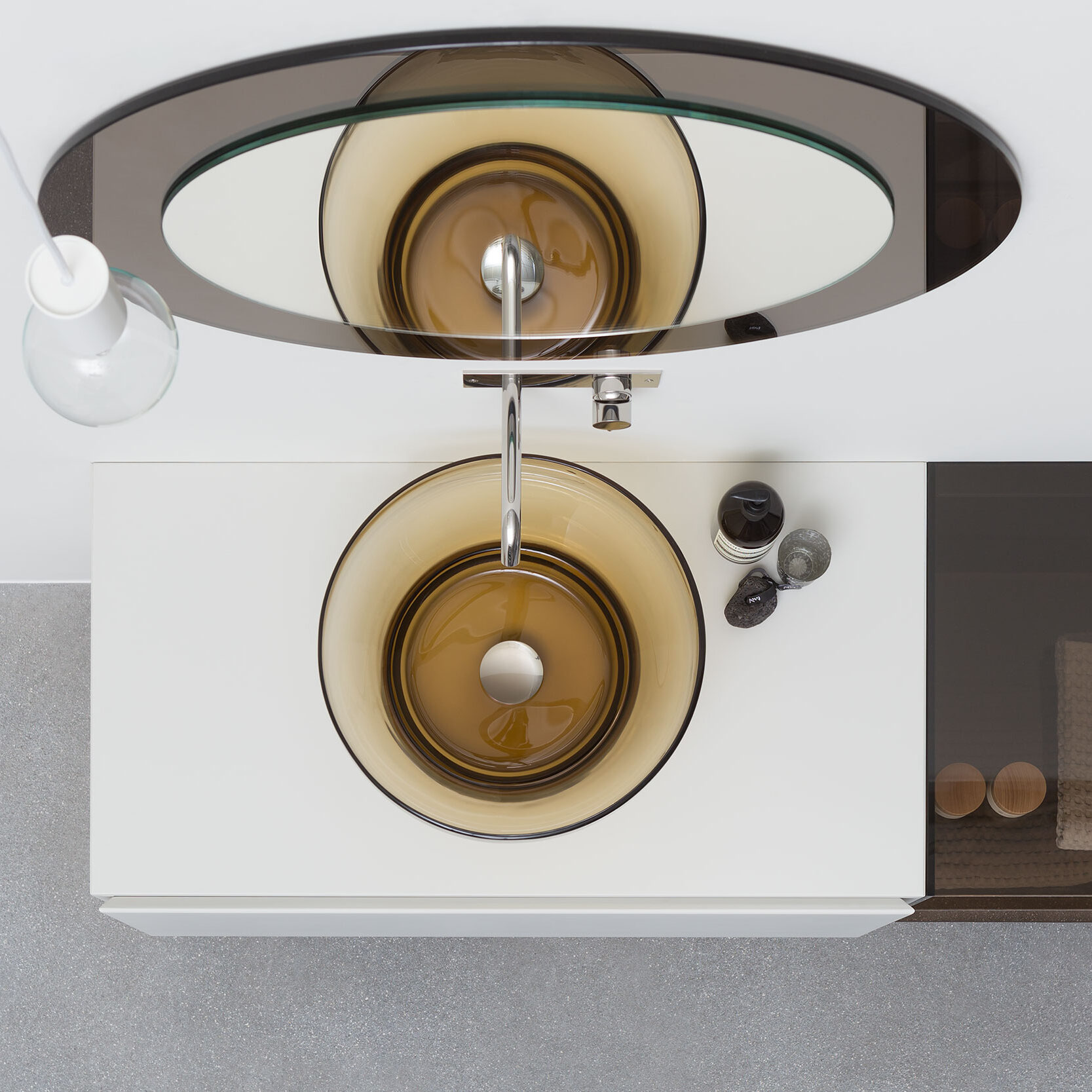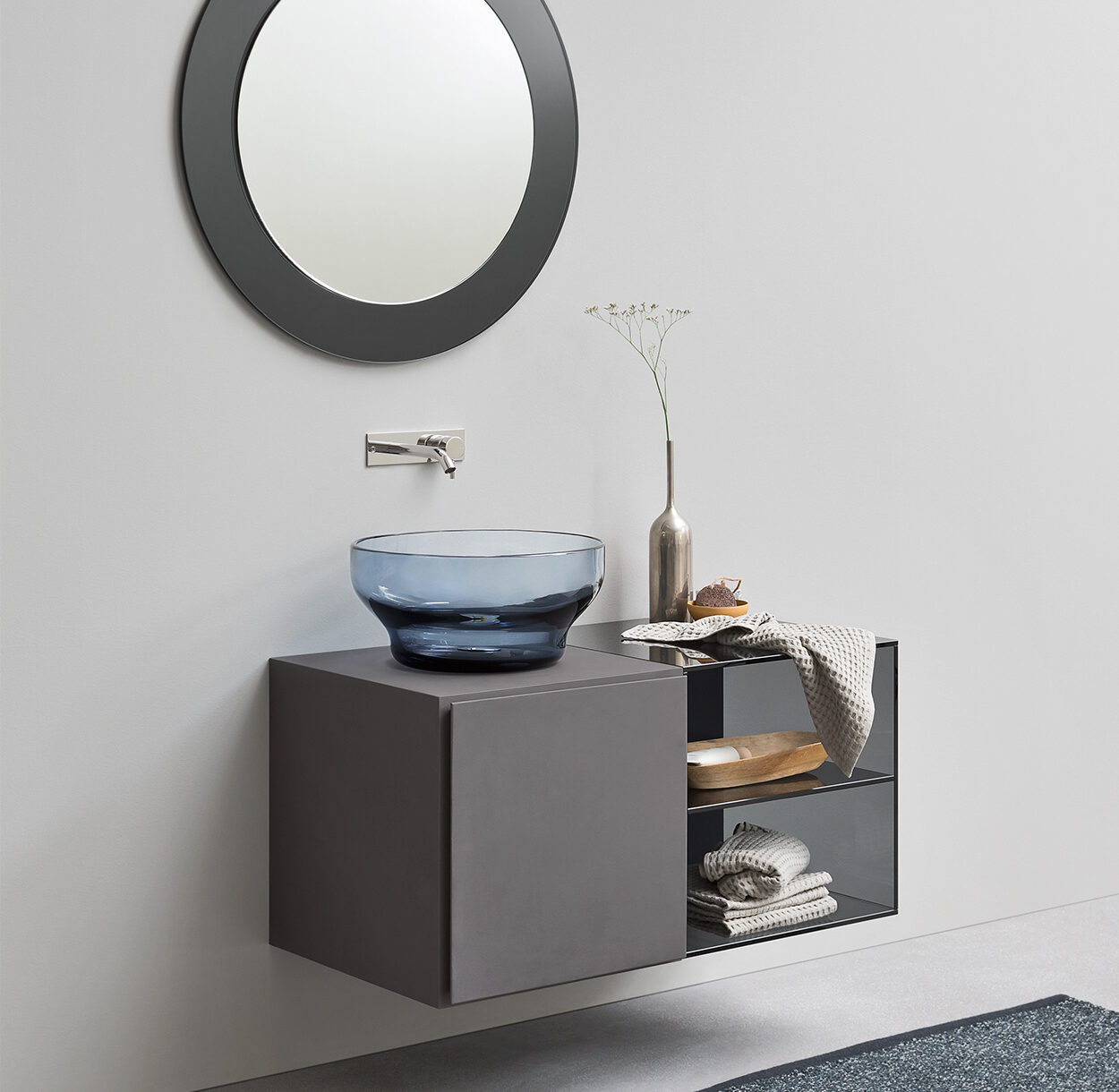 De Murano waskom laat zien wat mondgeblazen glas kan bereiken. Glaskunstenaars blazen het glas in houten mallen en vormen het met de hand tot een vloeiende kom. De variërende dikte en luchtbelletjes geven elk exemplaar een eigen karakter. Het transparante Grigio-glas speelt met licht en schaduw en brengt een warme, zachte sfeer in uw badkamer. Murano is zo ontworpen dat de buitenvorm strak blijft, terwijl de binnenkant uitnodigt tot gebruik. U plaatst de waskom op elk badkamerblad en combineert hem met decoratieve of functionele elementen.