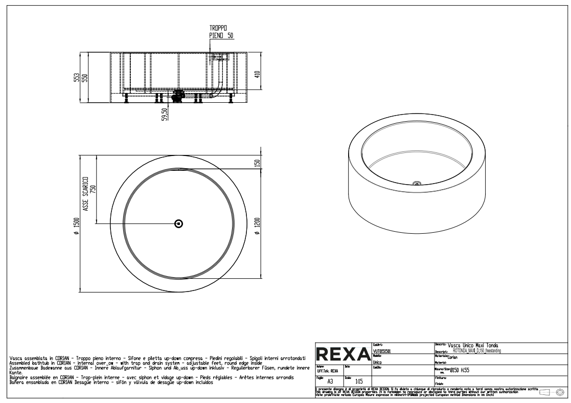 REXA Design is een merk dat badkamers omtovert met eenvoudige en stijlvolle oplossingen. Het Rotonda Maxi bad is rond en vrijstaand en komt in twee formaten: Ø150 cm of Ø170 cm. Dit bad is gemaakt van Corian®, een glad materiaal dat met de hand gepolijst is voor een zachte en uniforme uitstraling. U plaatst het bad los in het midden van de ruimte voor een strakke afwerking. Met de 4-gats badrandcombinatie zorgt u voor extra ontspanning thuis.