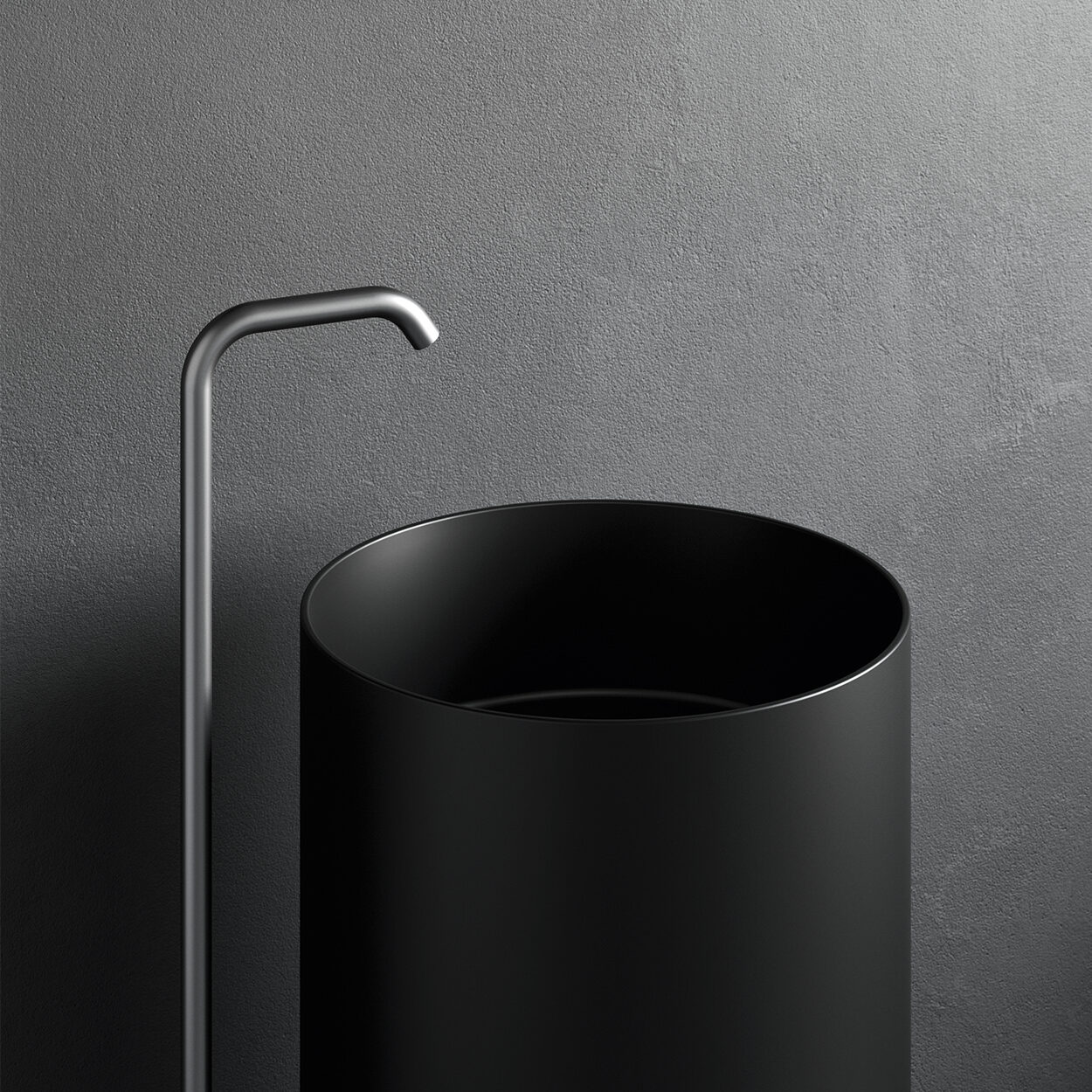 REXA Design zet een nieuwe standaard in badkamers met de Rotondo vrijstaande wastafel. Dit model combineert een perfecte cirkel en een slanke zuil tot een sculpturaal element dat direct de aandacht trekt. De wastafel heeft een diameter van 41 cm en staat op een hoogte van 90 cm. Het oppervlak is vervaardigd uit Corian® Deep Nocturne, met een zijdezachte afwerking zonder zichtbare naden. U plaatst dit model vrij in de ruimte, tegen de muur of in een hoek. Voor extra gemak kiest u een Mae mengkraan op de vloer die naadloos aansluit op het ontwerp.