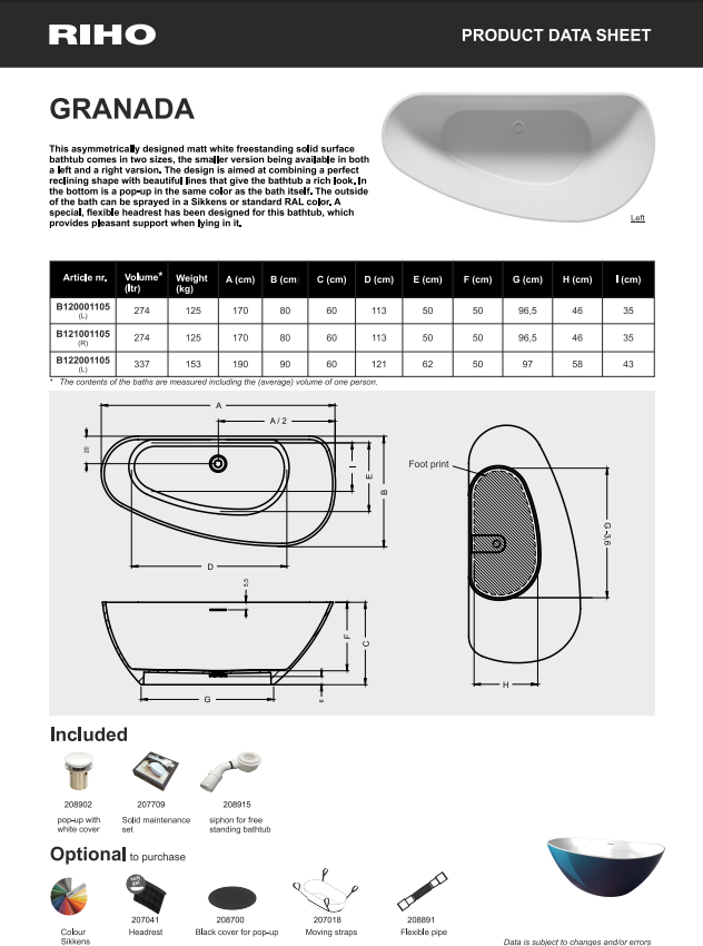 De Granada is verkrijgbaar in drie varianten: 170x80 cm (links), 170x80 cm (rechts) en 190x90 cm (links). Dankzij de ruime afmetingen biedt het bad optimaal ligcomfort, met een inhoud van 274 liter (170 cm) of 337 liter (190 cm). Het bad is standaard uitgevoerd in mat wit, maar kan aan de buitenzijde worden afgewerkt in alle actuele Sikkens-kleuren met keuze uit hoogglans of zijdeglans lak. Hiermee sluit de Granada perfect aan bij iedere badkamerstijl.