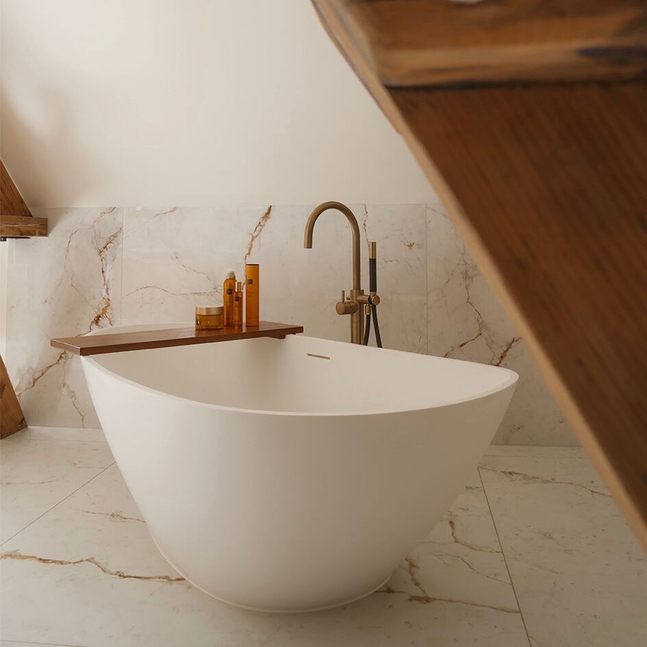 Het RIHO Granada vrijstaand bad combineert een organische vormgeving met het comfort van solid surface materiaal. Dit vrijstaande designbad is voorzien van een inwendige overloop en pop-up en wordt geleverd inclusief sifon en onderhoudset.