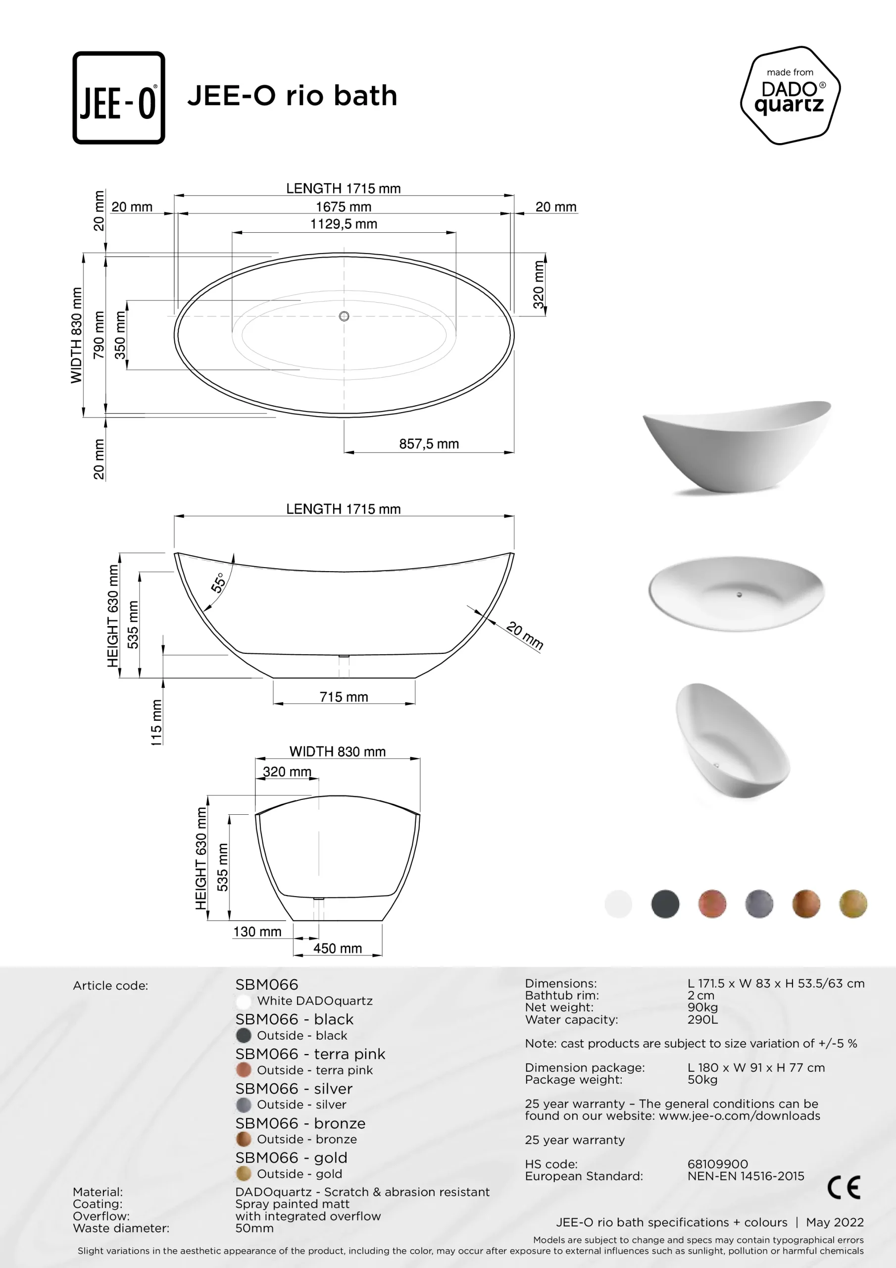Het  Rio bad van JEE-O is verkrijgbaar in de kleuren: Wit en Buitenzijde Zwart, Terra roze, Silver, Brons, Goud, Dark steel.
