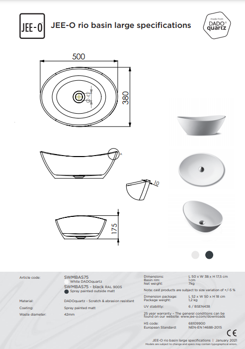 Rio waskom JEE-O, wastafel gemaakt van het zeer goede materiaal DADOquartz. De Rio waskom groot is verkrijgbaar in verschillende kleuren. De afmetingen van deze waskom zijn L 50 x B 38 x H 17,5 cm. Nu verkrijgbaar bij Stone Company.