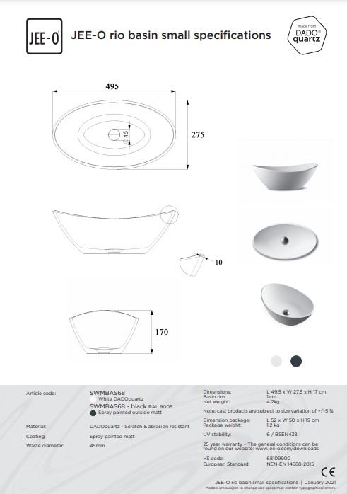 Rio waskom klein JEE-O, Opbouwwastafel met de afmetingen L 49,5 x B 27,5 x H 17 cm. Deze wastafel is gemaakt van het materiaal DADOquartz. Hij is verkrijgbaar in verschillende kleuren en past ook mooi met de andere producten van JEE-O. Nu verkrijgbaar bij Stone Company.