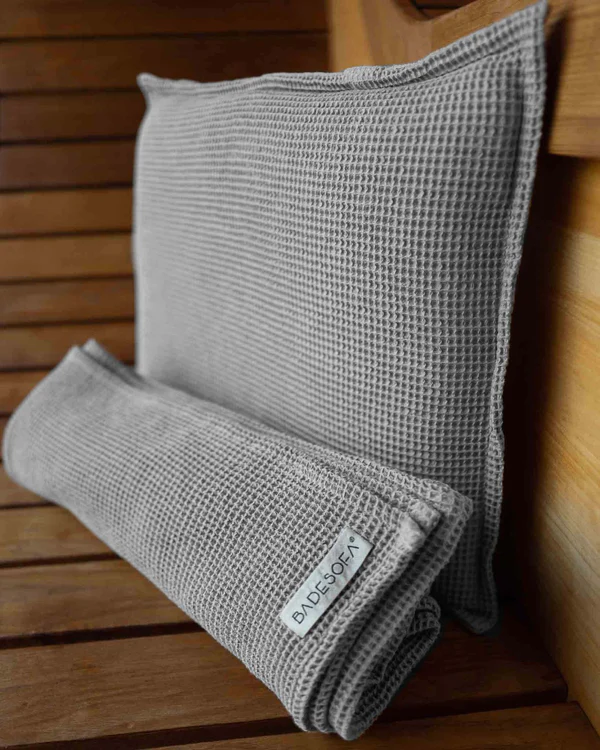 De Saunasofa set van Badesofa biedt ultiem comfort tijdens uw saunabezoek. Deze set bestaat uit een stevig kussen en een bijpassende badhanddoek, beide ontworpen om uw sauna-ervaring aangenamer te maken. Het kussen ondersteunt uw hoofd en nek, terwijl de badhanddoek zorgt voor een zachte en droge ondergrond. Het wafelpiqué katoen voelt prettig aan op de huid en is goed absorberend. Dankzij de ademende materialen blijft het kussen fris en comfortabel, ook bij langdurig gebruik. Na uw saunasessie is de set eenvoudig te wassen en snel weer klaar voor gebruik.