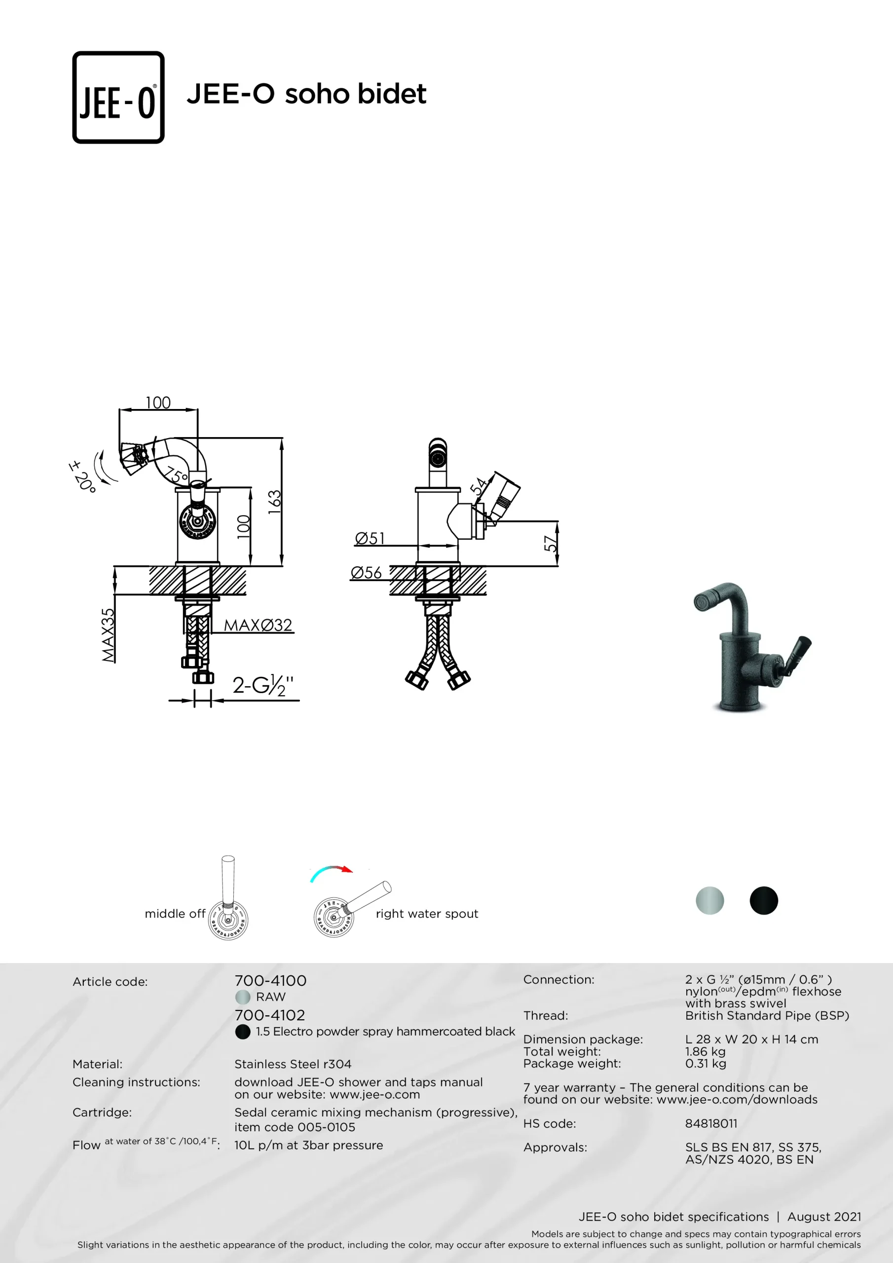 De Soho bidetkraan JEE-O is verkrijgbaar in de kleuren: