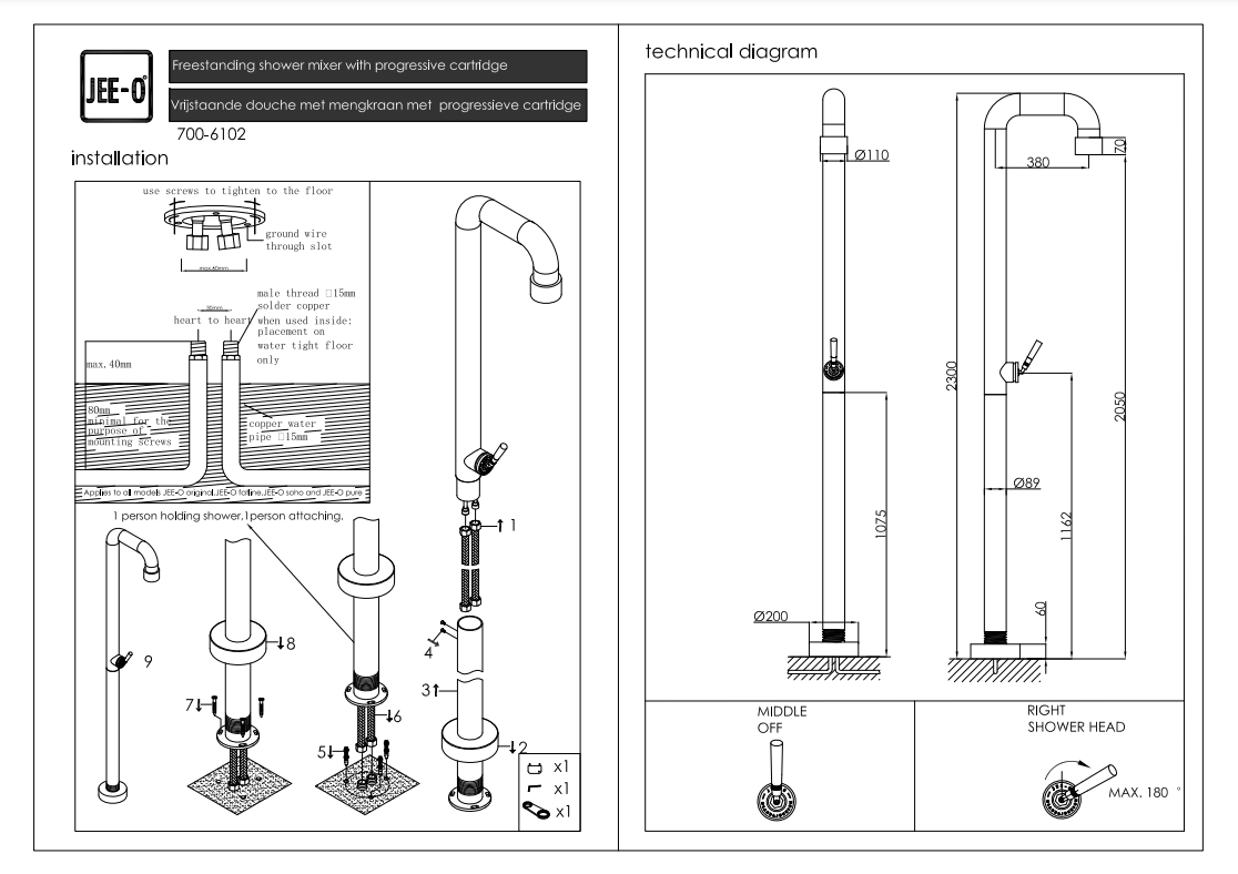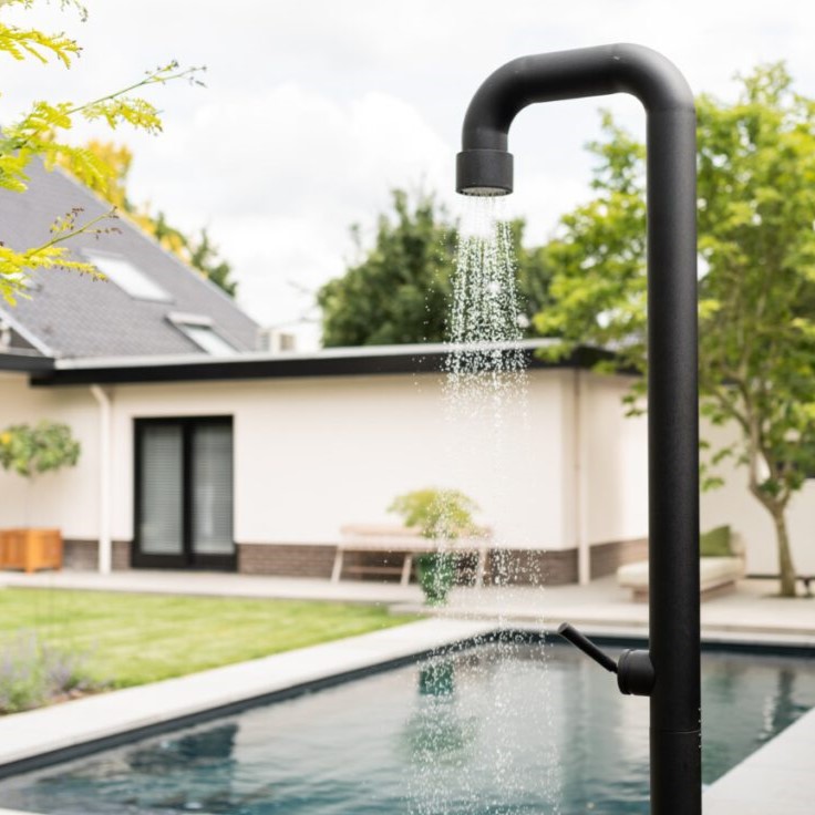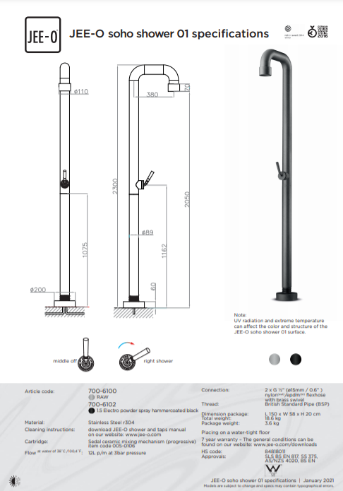 Soho douche 01 JEE-O, Moderne vrijstaande douche. De douche is vanwege het industriële design een echte eyecatcher. Bevat een ééngreepsmengkraan. Hierdoor is de douche gemakkelijk te bedienen, Met een handomdraai gaat de kraan en regel je ook de temperatuur. Douche is ook vekrijgbaar met een 365 all weather frost free optie. Vanwege deze optie kan de douche met alle weeromstandigheden ook al buitendouche gebruikt worden. Enige tijd geleden is de SOHO 01 onderscheiden met de Red dot design award en de German design award. Nu verkrijgbaar bij